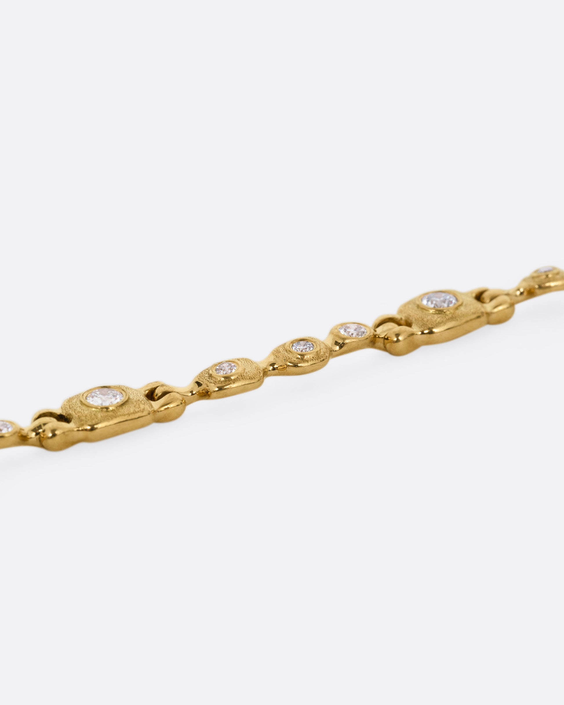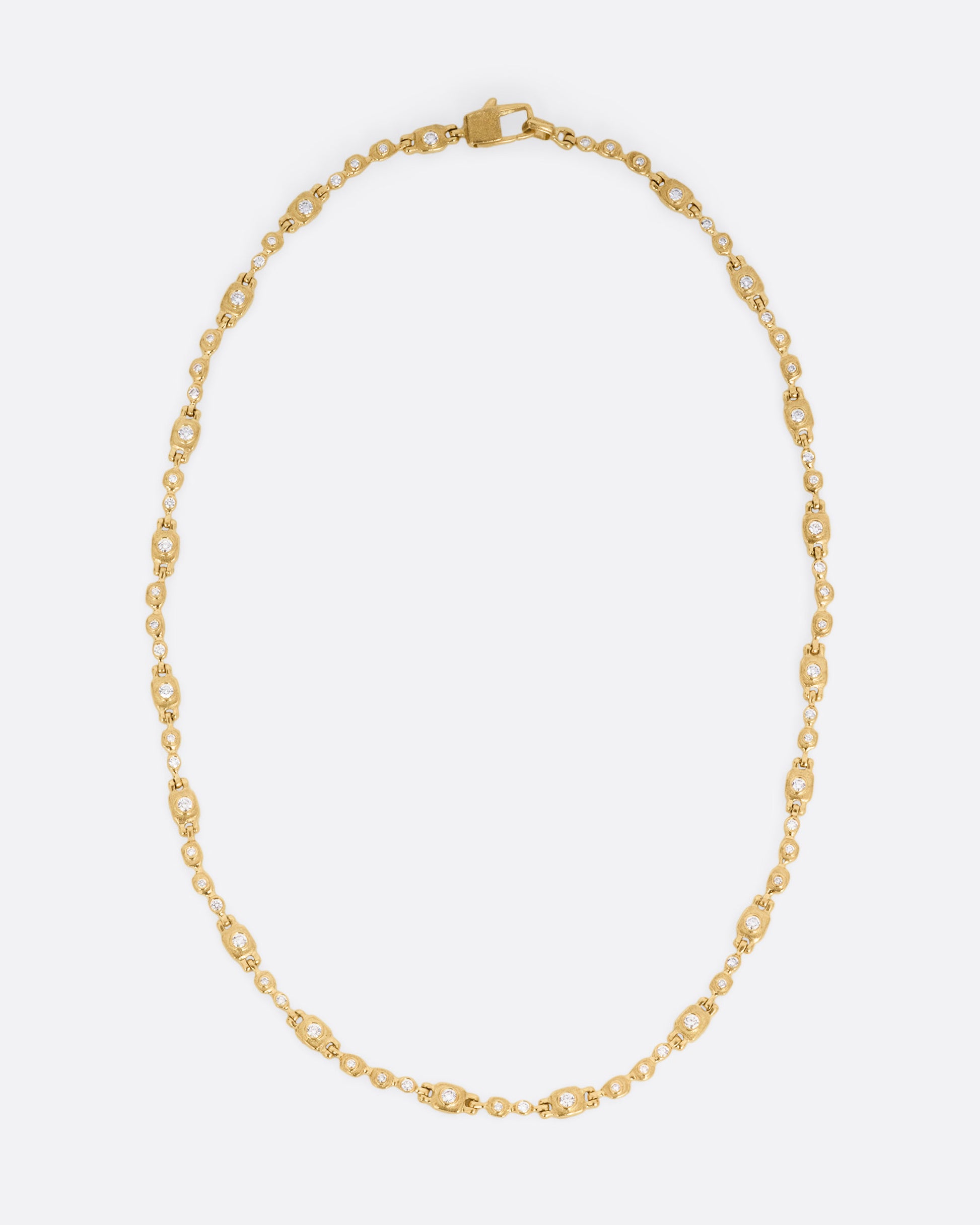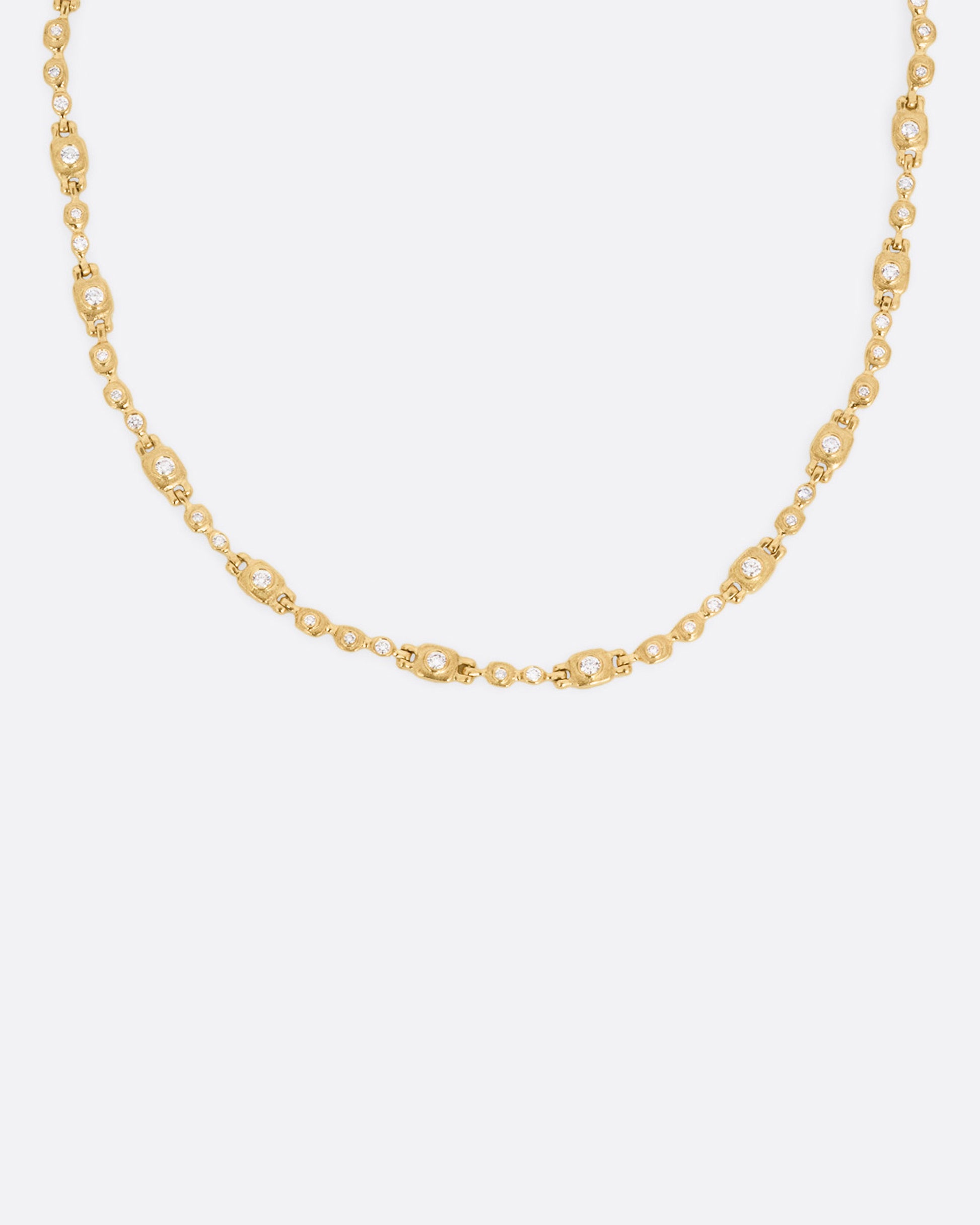 A twist on the classic diamond tennis necklace, each brilliant cut diamond is set in handmade, organic stations. Hinged connections ensure that the piece lays flat as you move through your day. A stunning piece that can be worn solo or as an anchor with a more layered look.