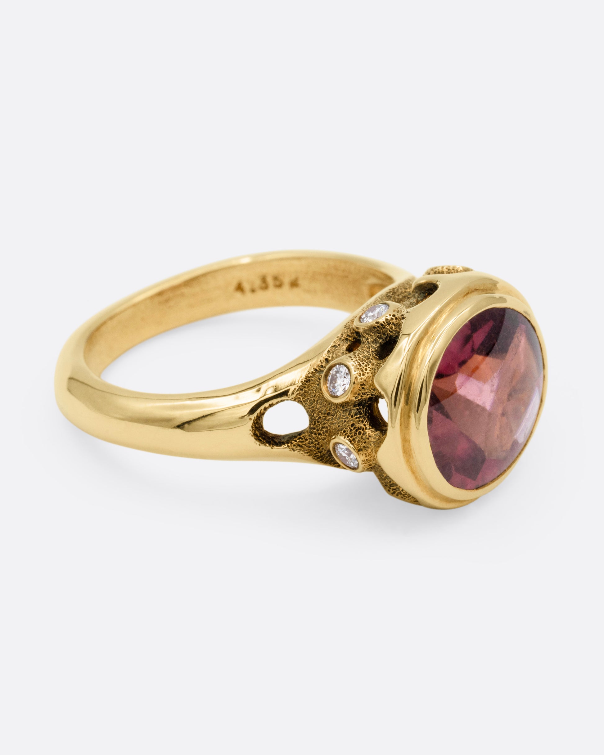 Open cutouts and white diamonds accentuate this substantial pink tourmaline as it smolders from this sculptural band.