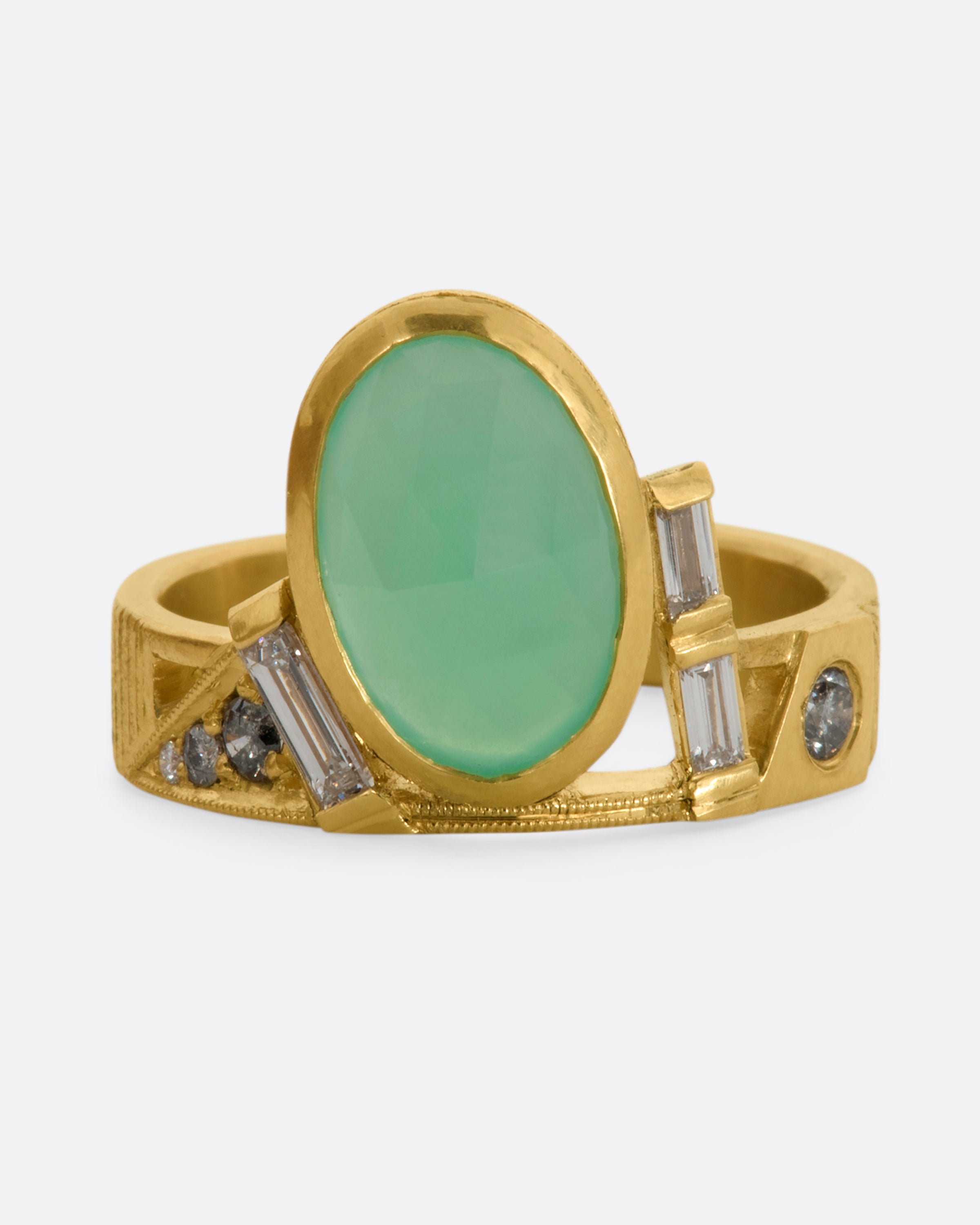 This one-of-a-kind ring from DMD Metal balances the boldness of its soft green Australian chryso...