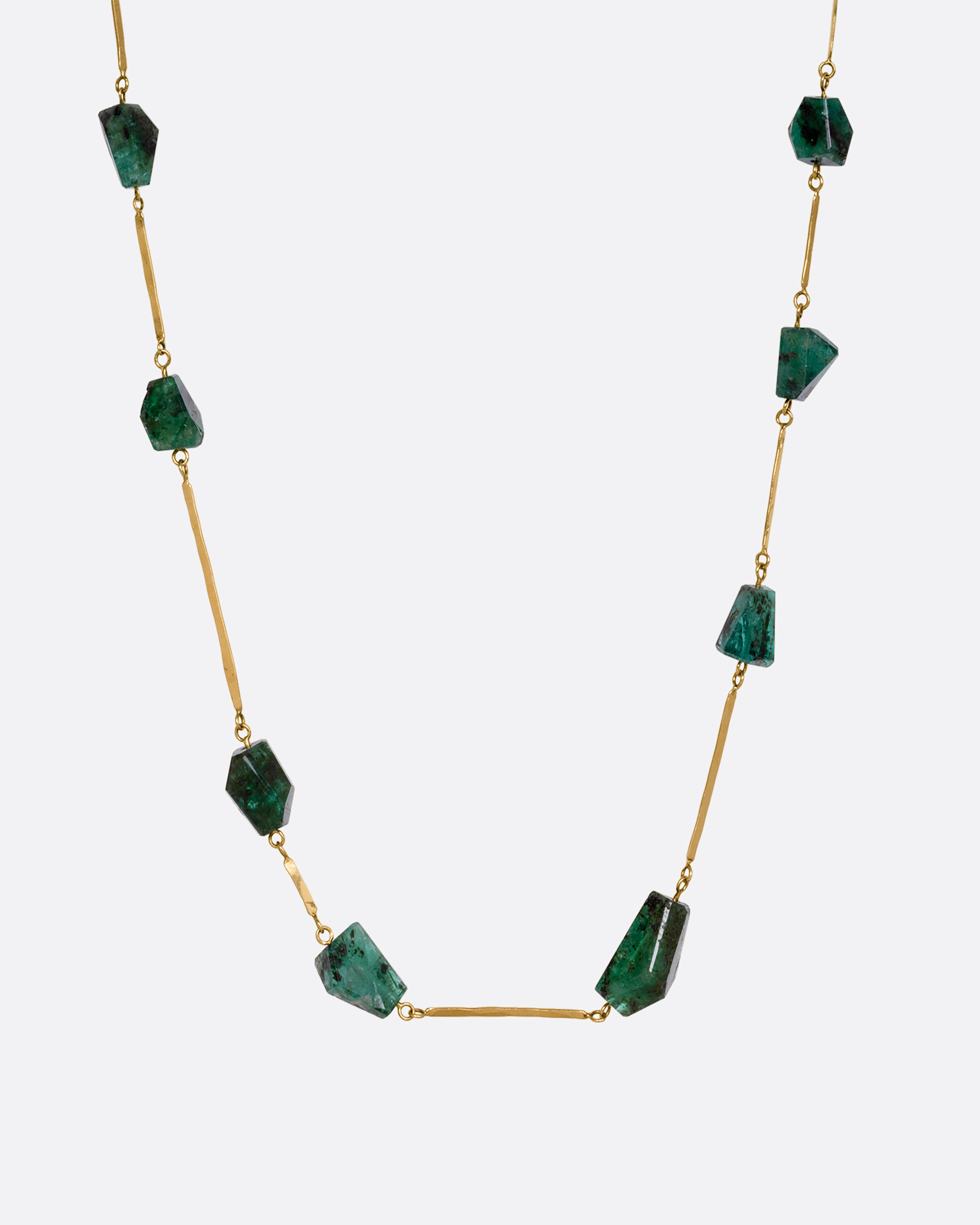 Hammered hook earrings are threaded through these stacked freeform emeralds. With an open, minimalist design, light refracts through each gemstone, accentuating the vivid green hue and inclusions.