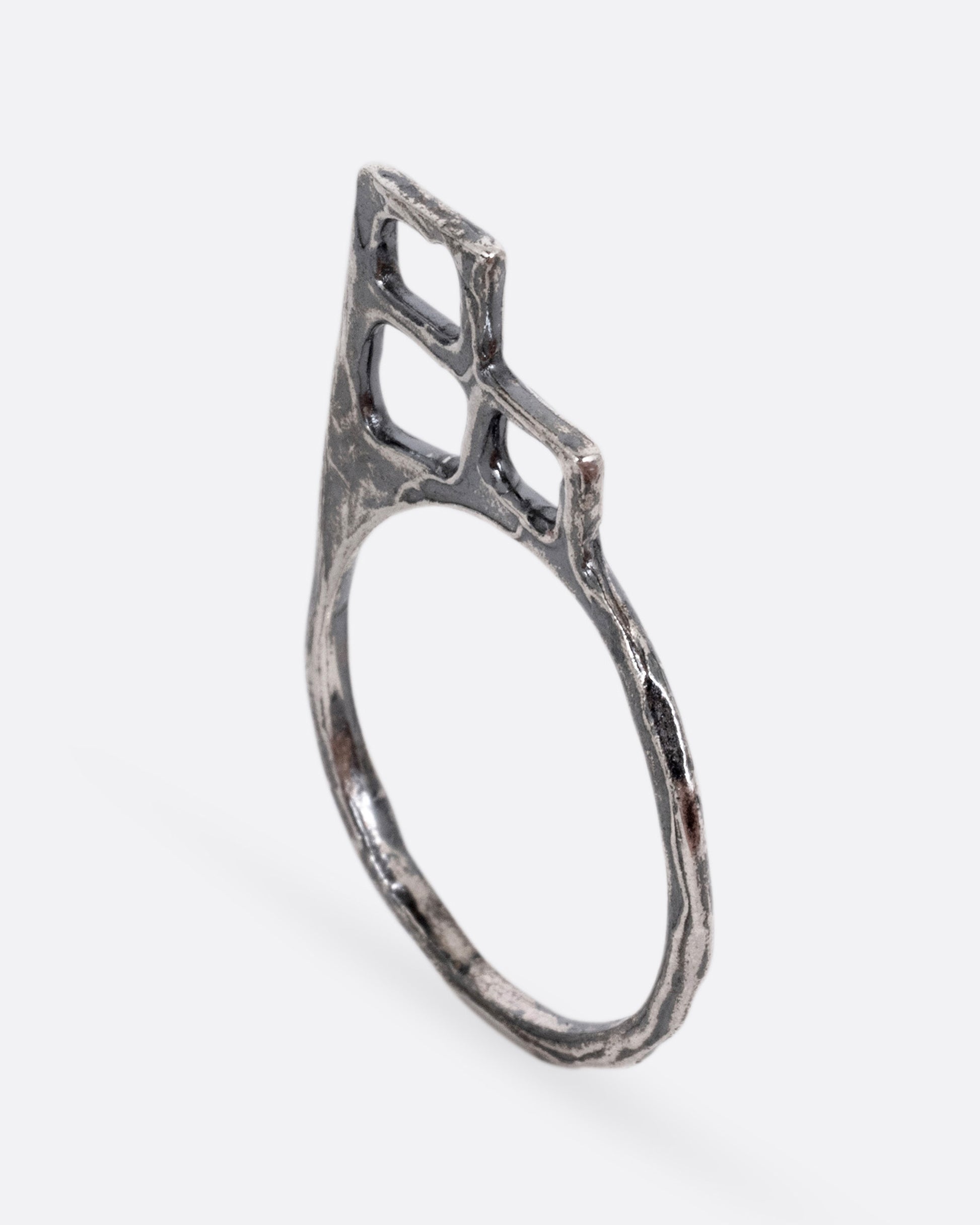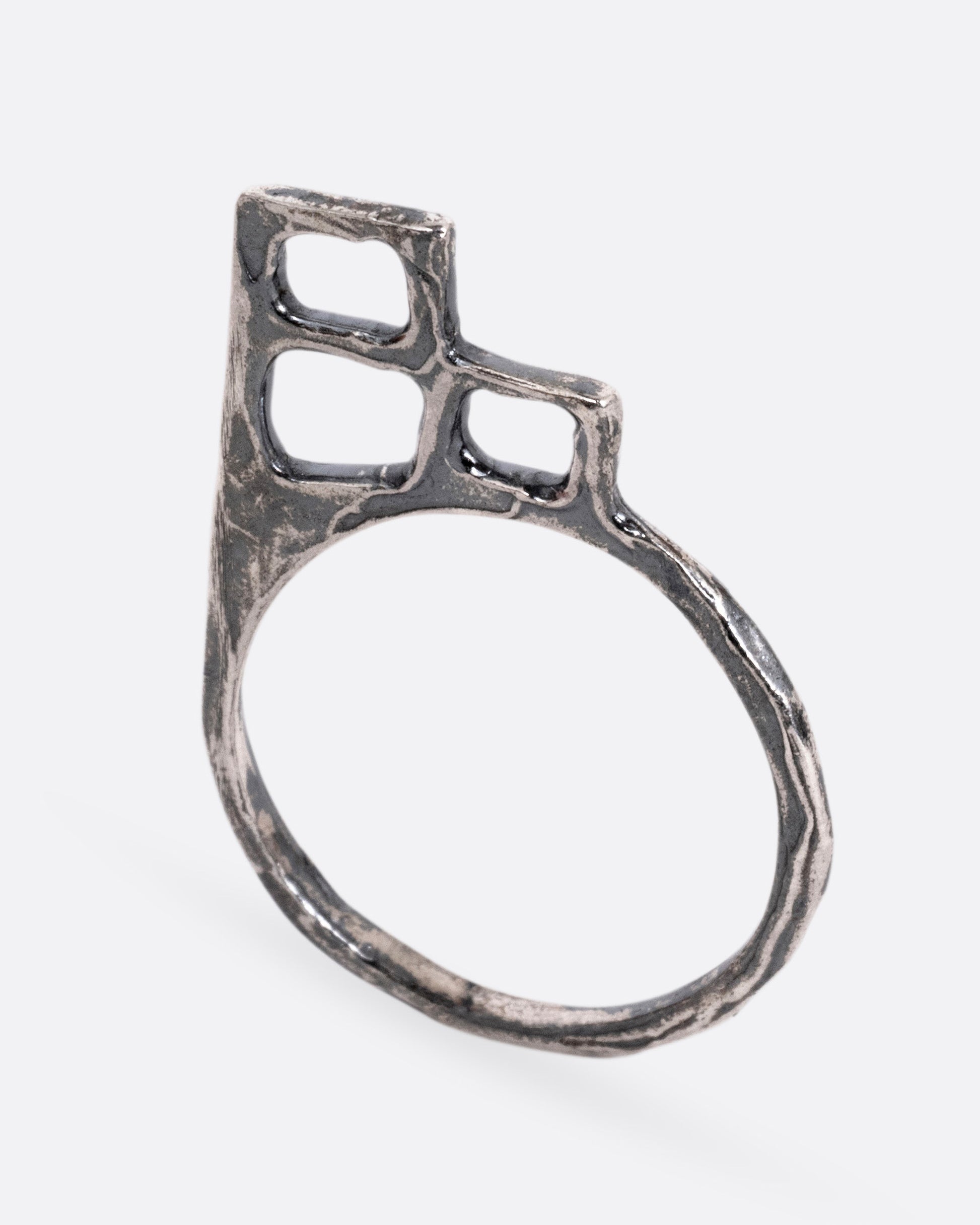 Add height to your hand with this trio of open windows. Hammered to a very fine width, this unique statement band stacks seamlessly... towering above the rest.