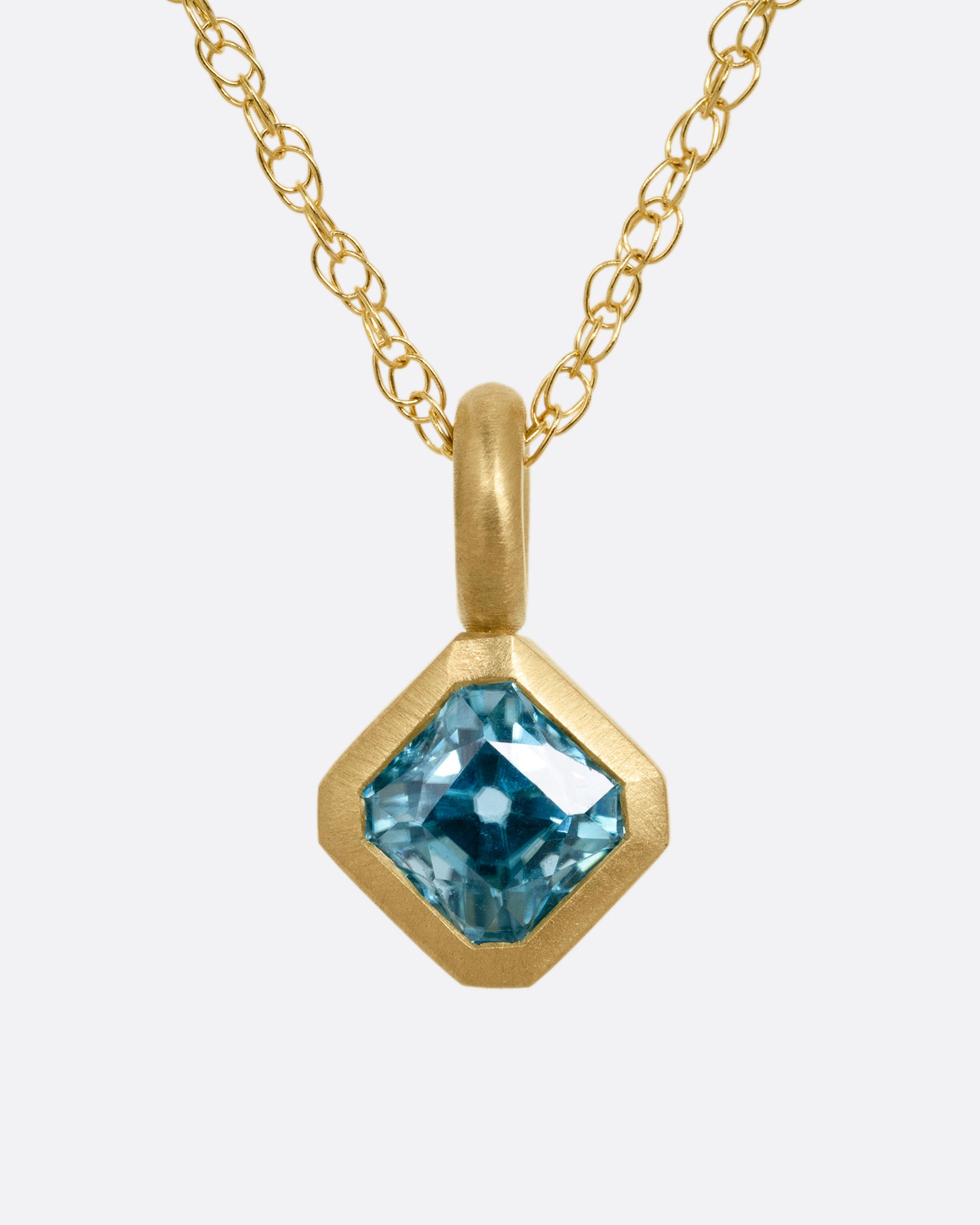 The blue green hue of this blue zircon brings to mind visions of tropical shores. The satin finish of its heavy bail makes the color standout even more.