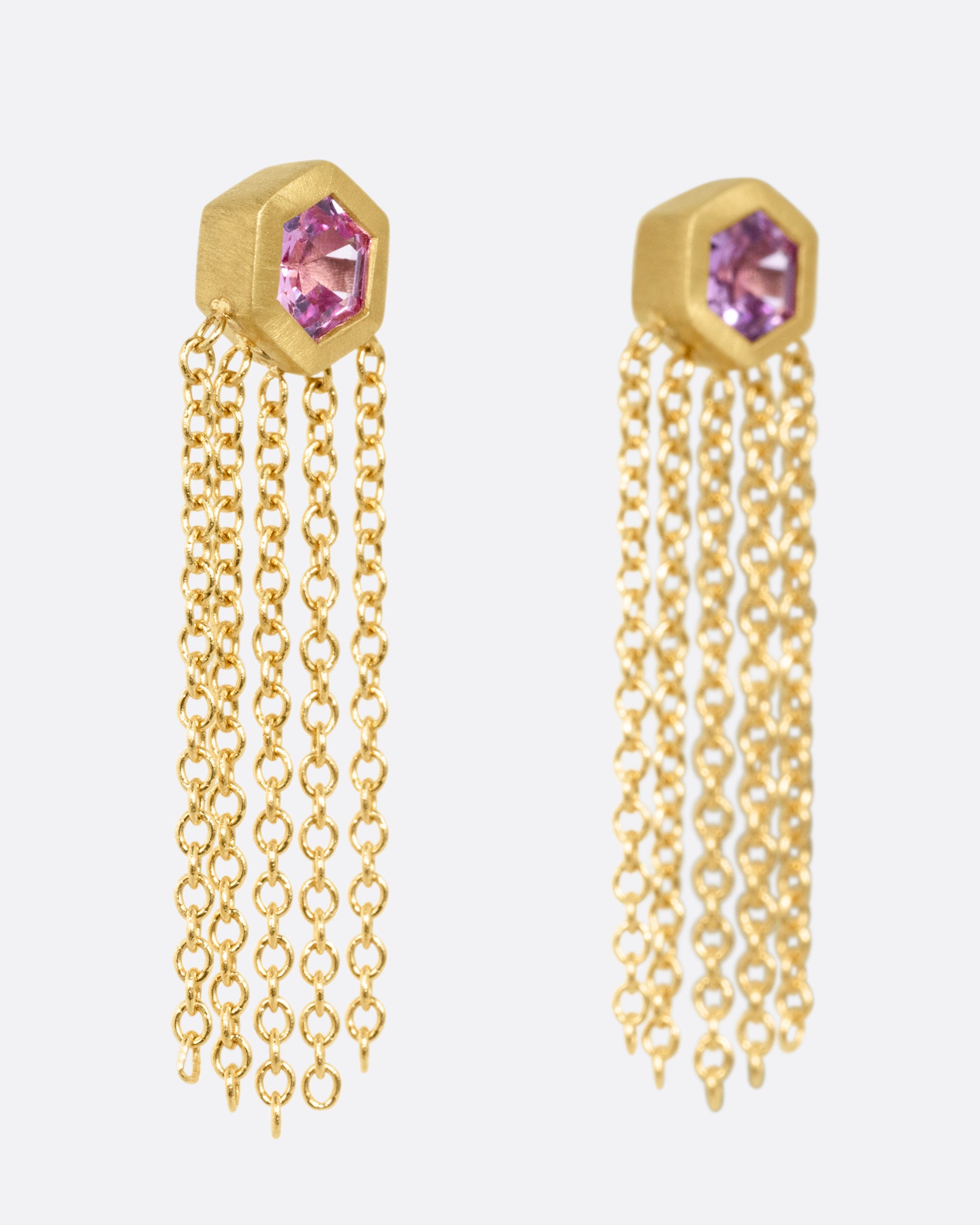 Cable chain fringe adds a bit of length and playful movement to this pair of hex shaped sapphire studs. One sapphire is pink, the other lavender, creating a subtle eye- catching look.