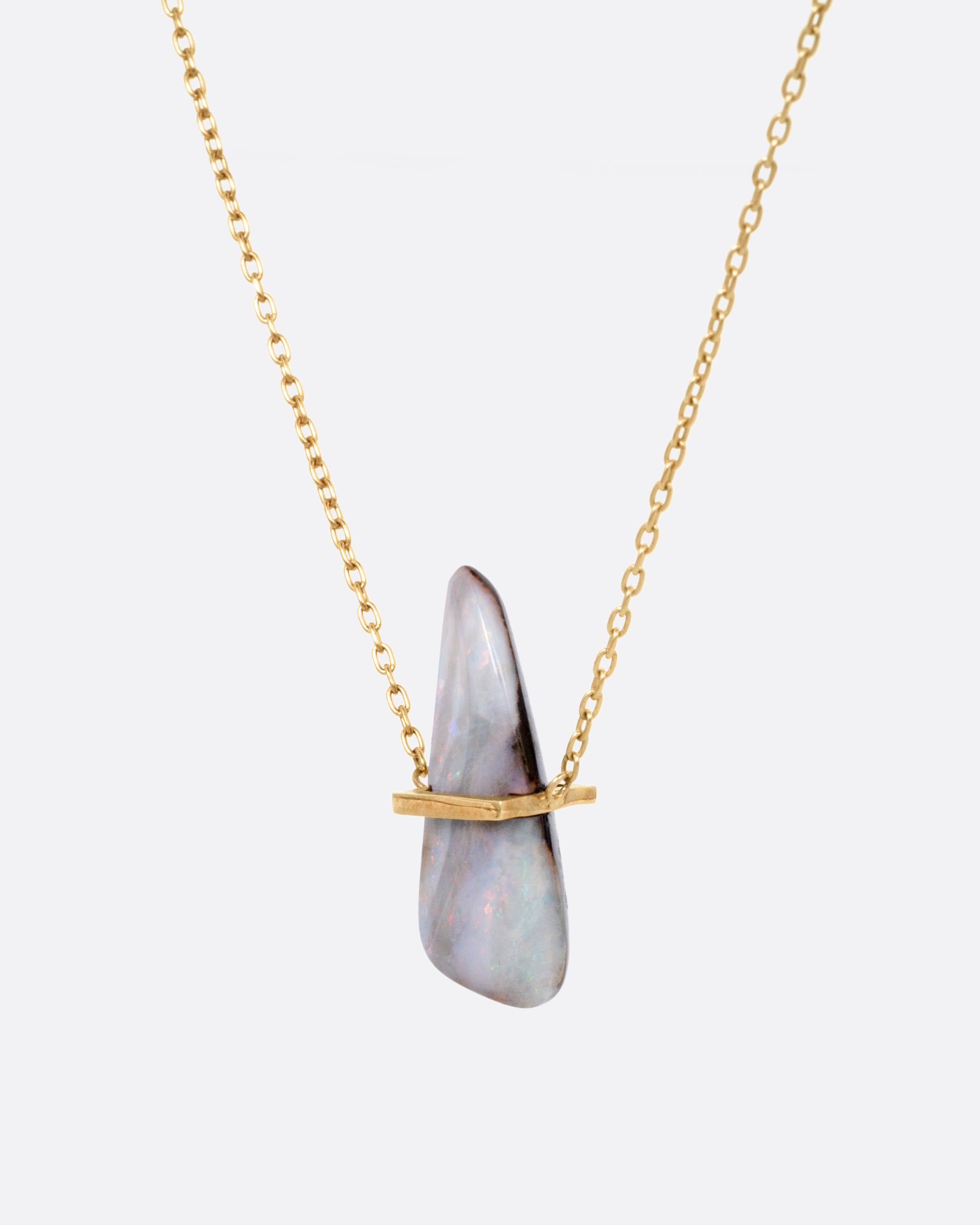 The open, unrestrained quality of Januka's signature bar setting showcases the play-of-color in this freeform opal from every angle... A lengthy layering piece.