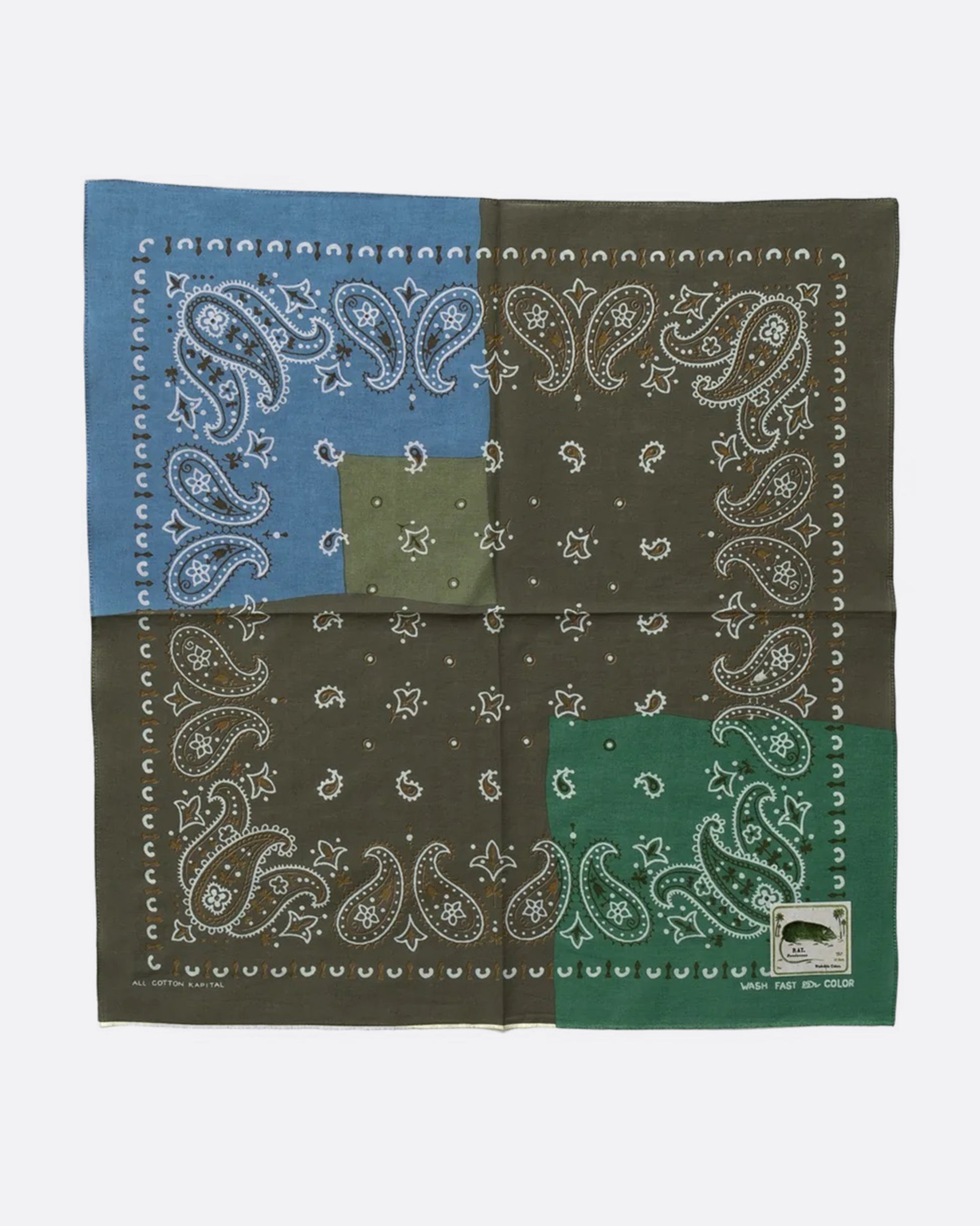 Discharge dyed in a unique khaki and blue paisley patchwork design, this classic Kapital selvedge bandana is soft yet sturdy. Style it on your neck, head, or tie it to your favorite bag for a patterned pop.