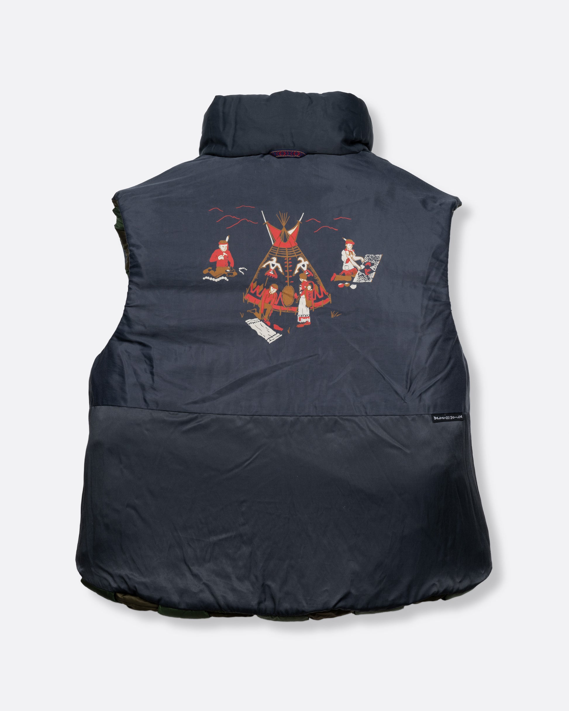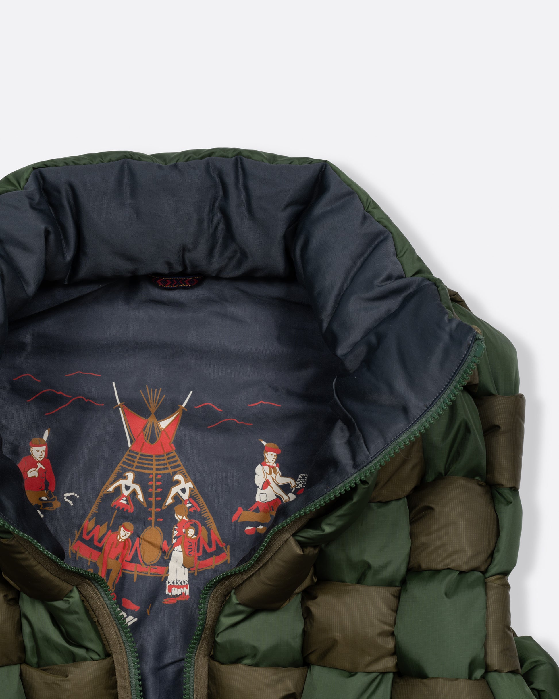 This fully lined, oversized padded vest in tonal khaki green nylon is woven in a cool traditional basket weave design. With a reversible grey interior, a front zip closure, curved hemline, and internal snap welt hand pockets, you'll remain cozy and chic on the chilliest of days.