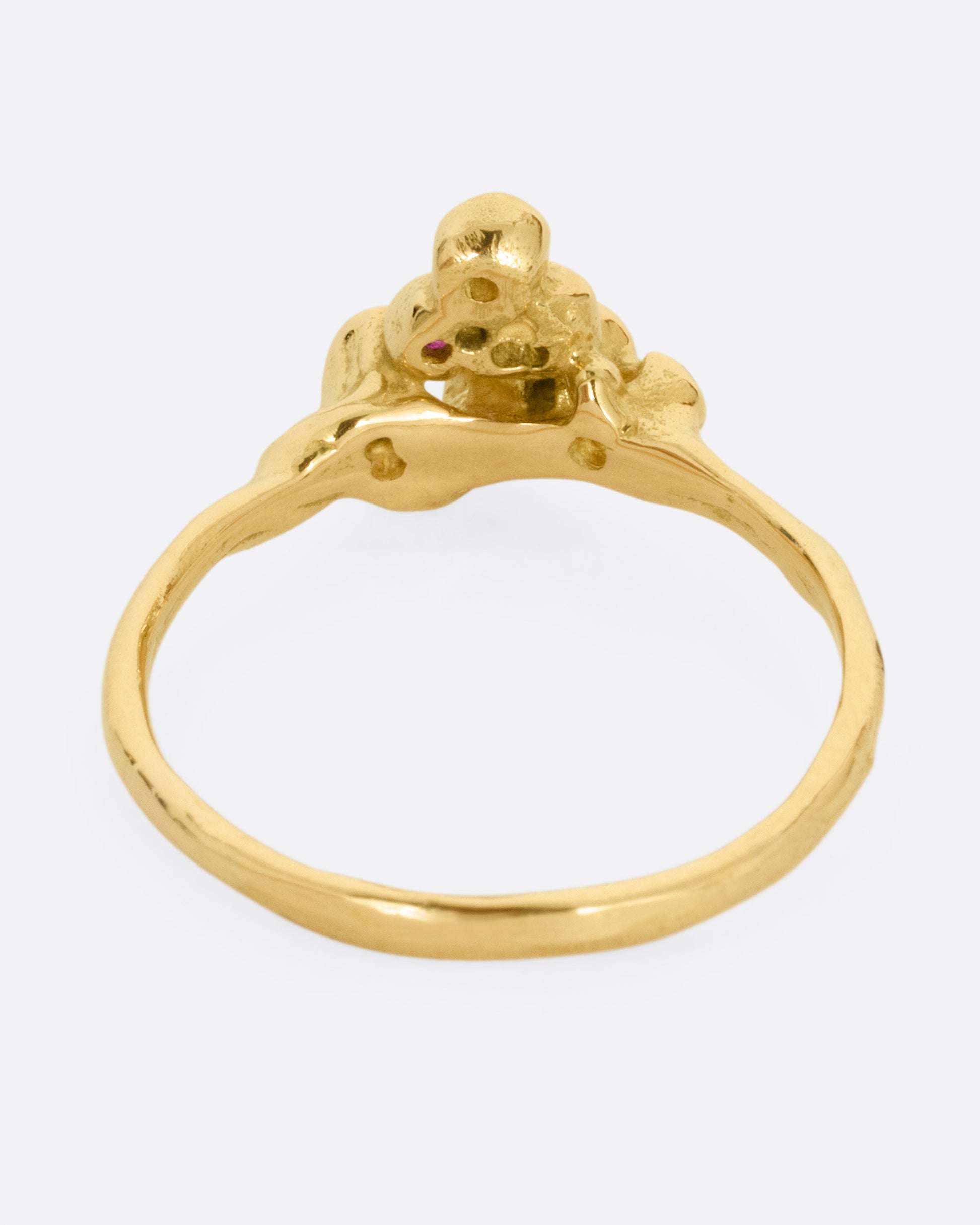 An enigmatic cluster of rubies, diamonds, and pink sapphires throws sparkle from every angle as it ventures up your finger.
