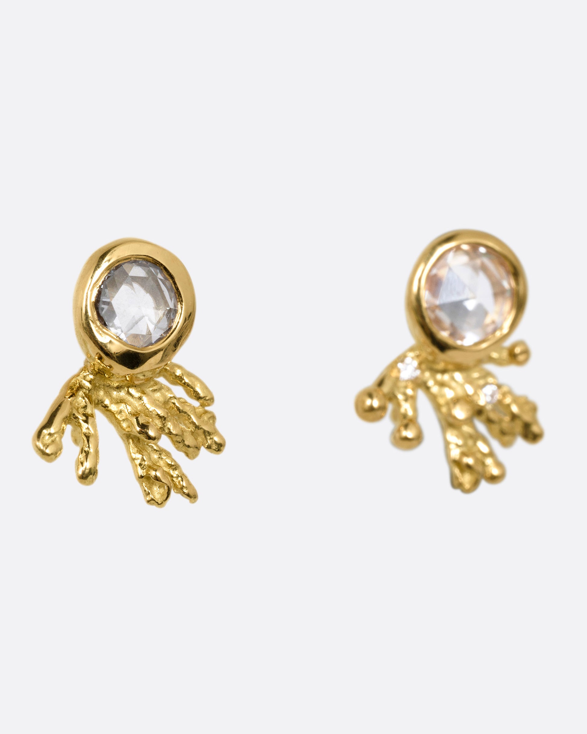Like luminous comets with golden tails, this duo of rose cut diamonds sparkle from textural gold settings. An easy pair to dress up or down.