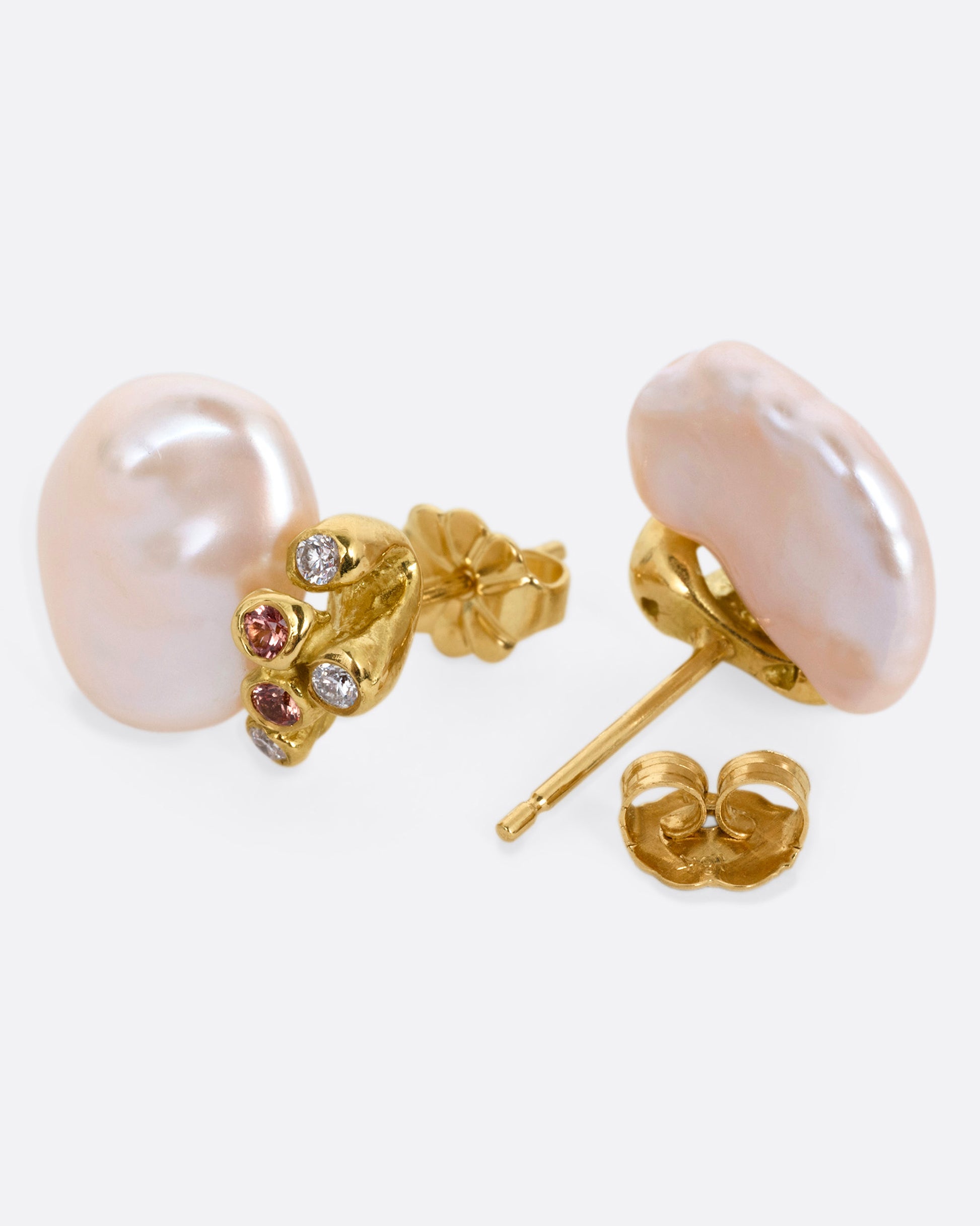 Diamond and orange sapphire clusters perch atop two pink freeform Keshi pearls... A cool departure from the traditional.