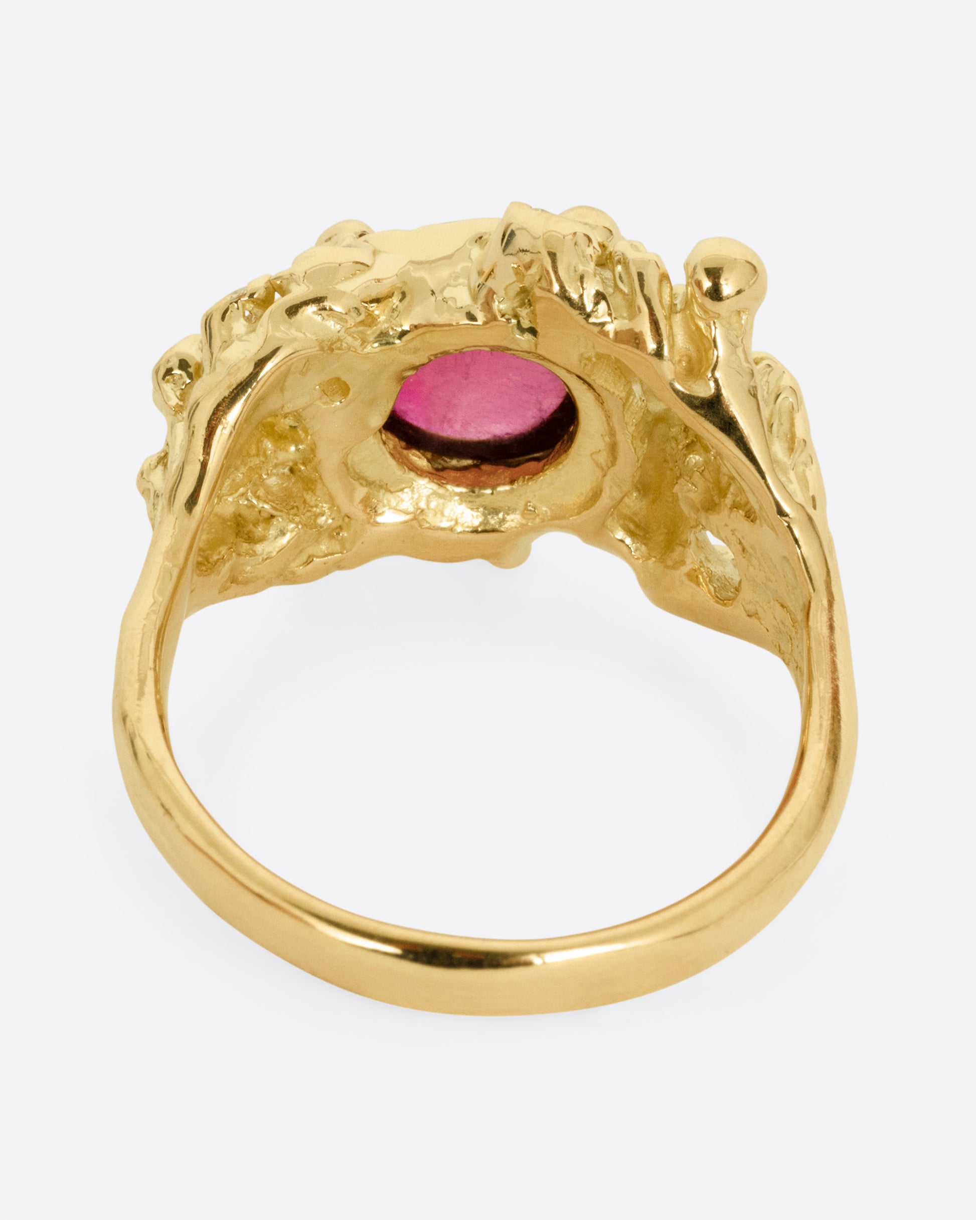 Nestled in a sprawling bed of diamond tipped anemones, a rubellite smolders in deep red. This visually striking statement ring boasts both sparkle and texture, while remaining comfortable and wearable.