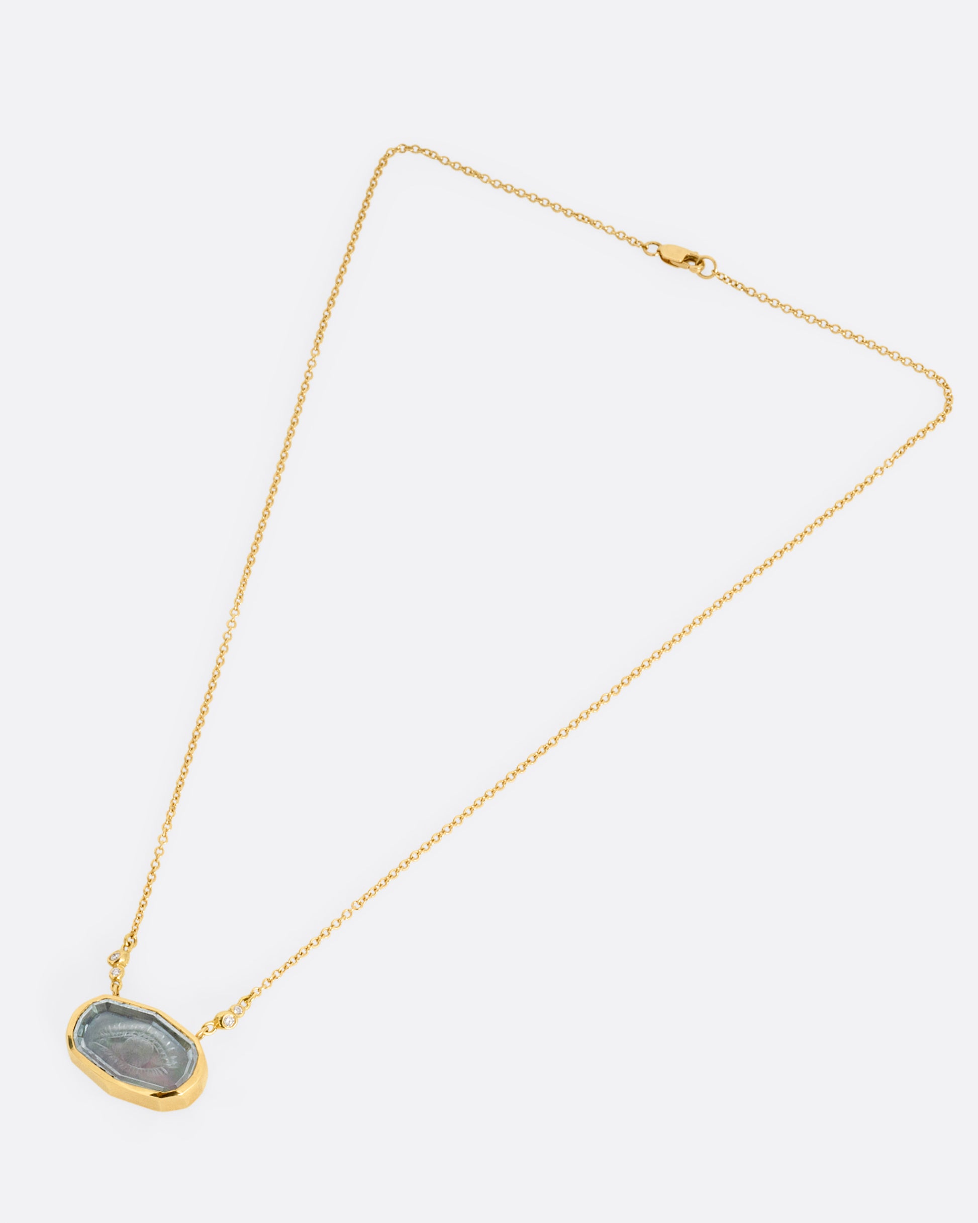 Created by the hands of beloved designer Kimberlin Brown, this piece is part of our 'Hand of the Artist' capsule collection. A single hand carved eye gazes from this translucent bezel set quartz, as a slice of iridescent abalone shimmers from behind. Kimberlin's signature diamond anemones accent the fine cable chain. A bit of kaleidoscopic vision for your layered neck mess.
