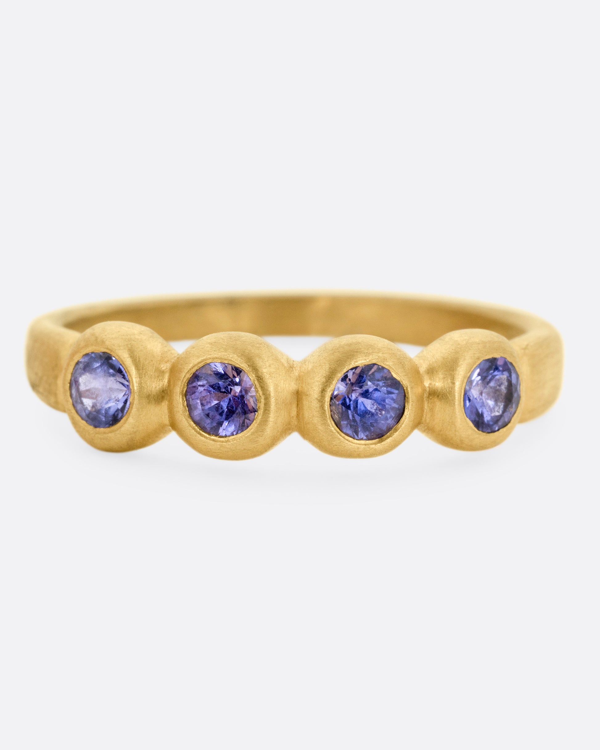 A luminous quartet of purple sapphires nestle into this satiny gold band. A substantial stacker, statement band, or the perfect gift for your favorite Capricorn.