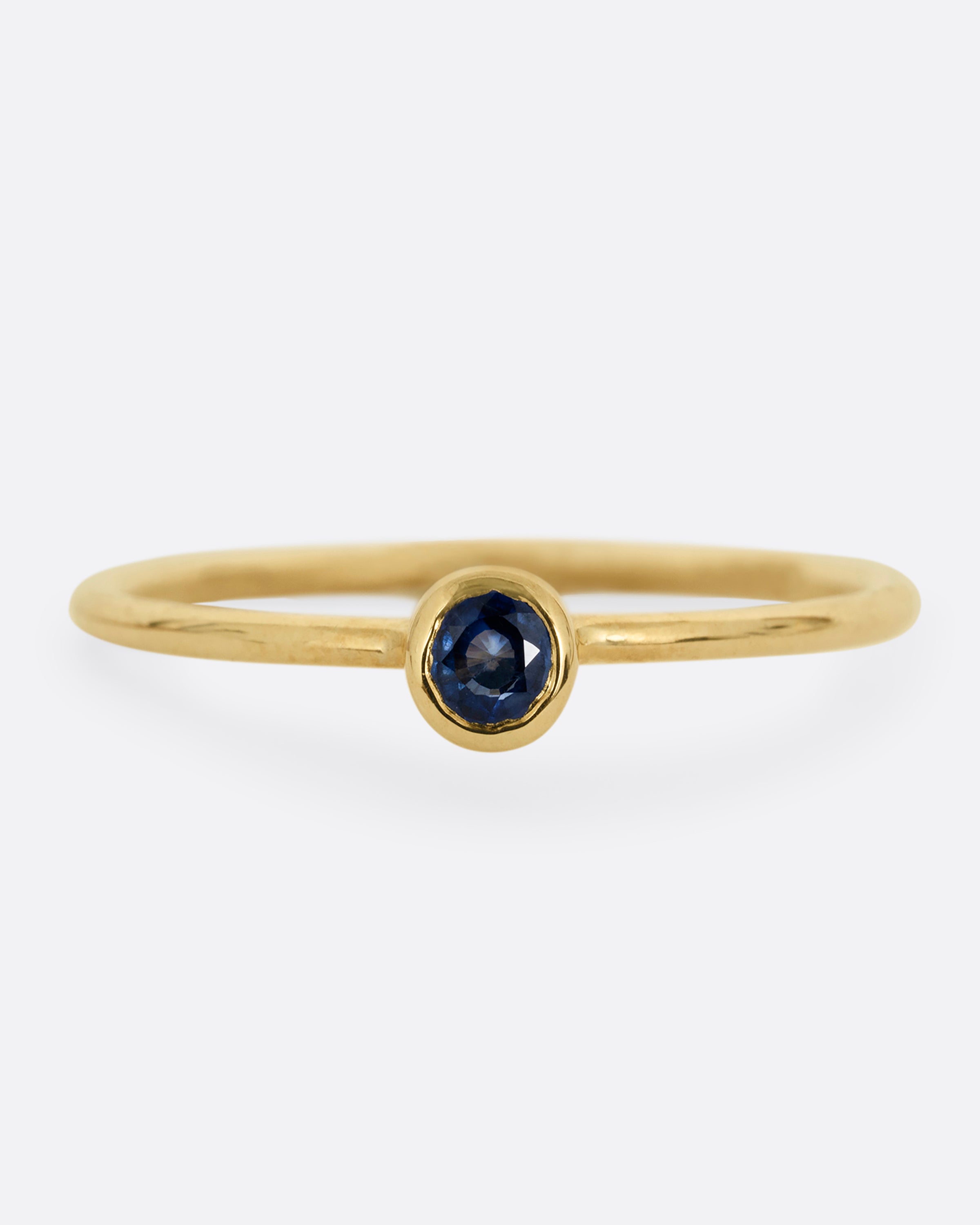 An emerald baguette is bezel set high atop this narrow yellow gold band, making it a great stacker.