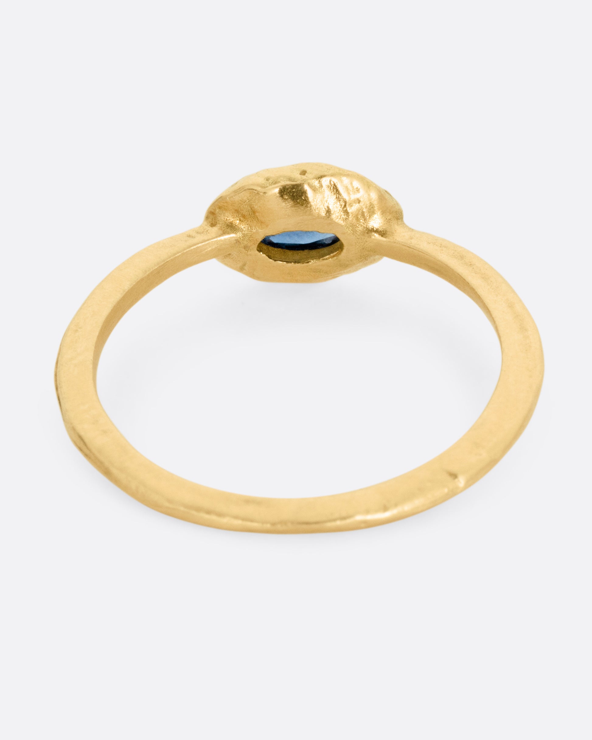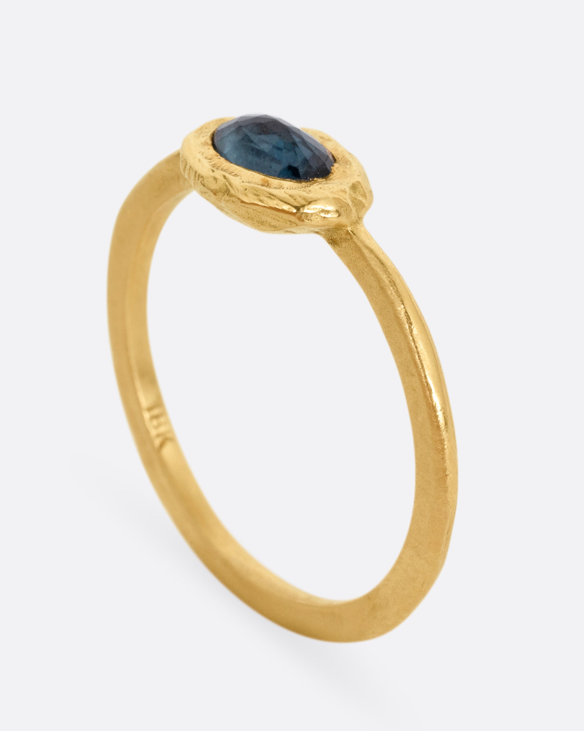 The bit of dimension your stack has been missing, this teal sapphire gently rises from this narrow hand carved band.
