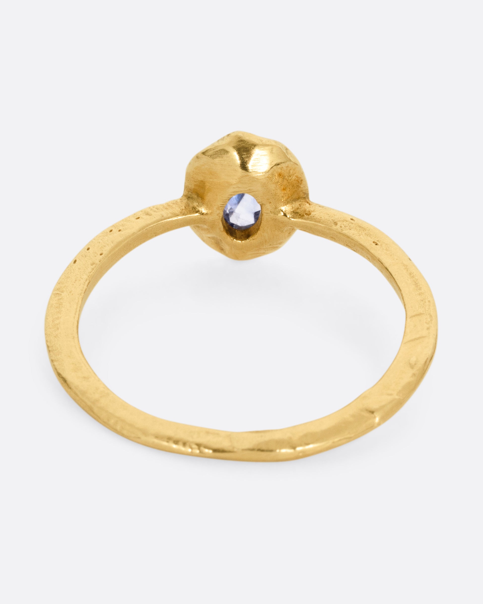 A placid blue sapphire adds dimension to your stack as it arises from this narrow hand carved band.