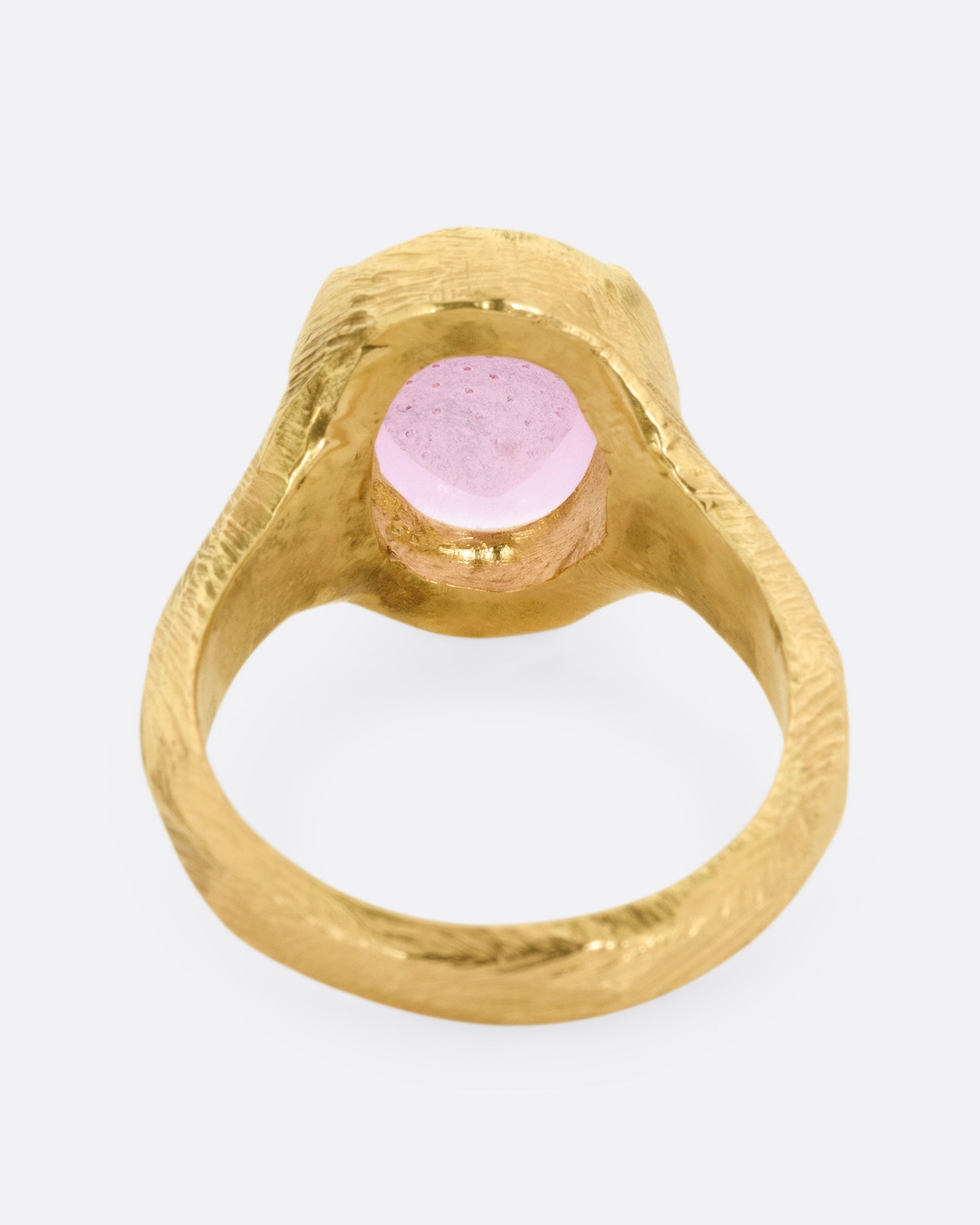 A sweet hand carved strawberry glows from the center of this prong set rosy pink garnet. From the bench of designer, Page Sargisson, this hand carved signet is part of our 'Hand of the Artist' capsule collection.