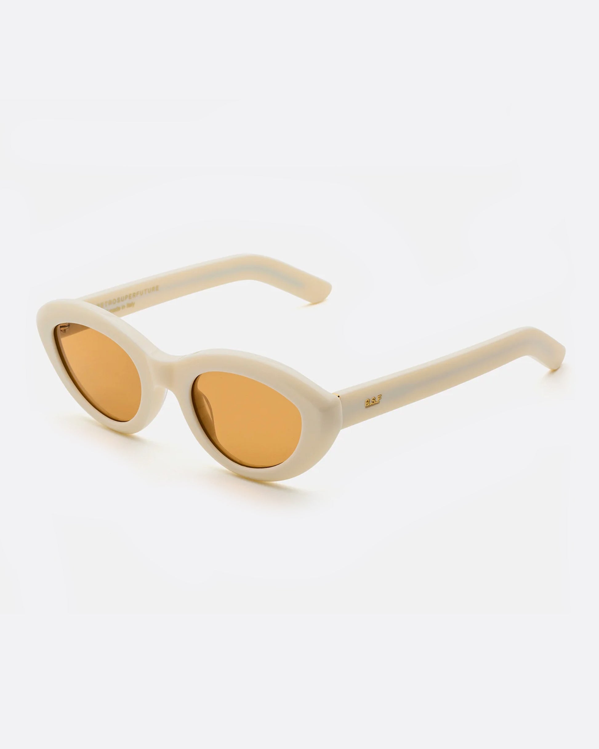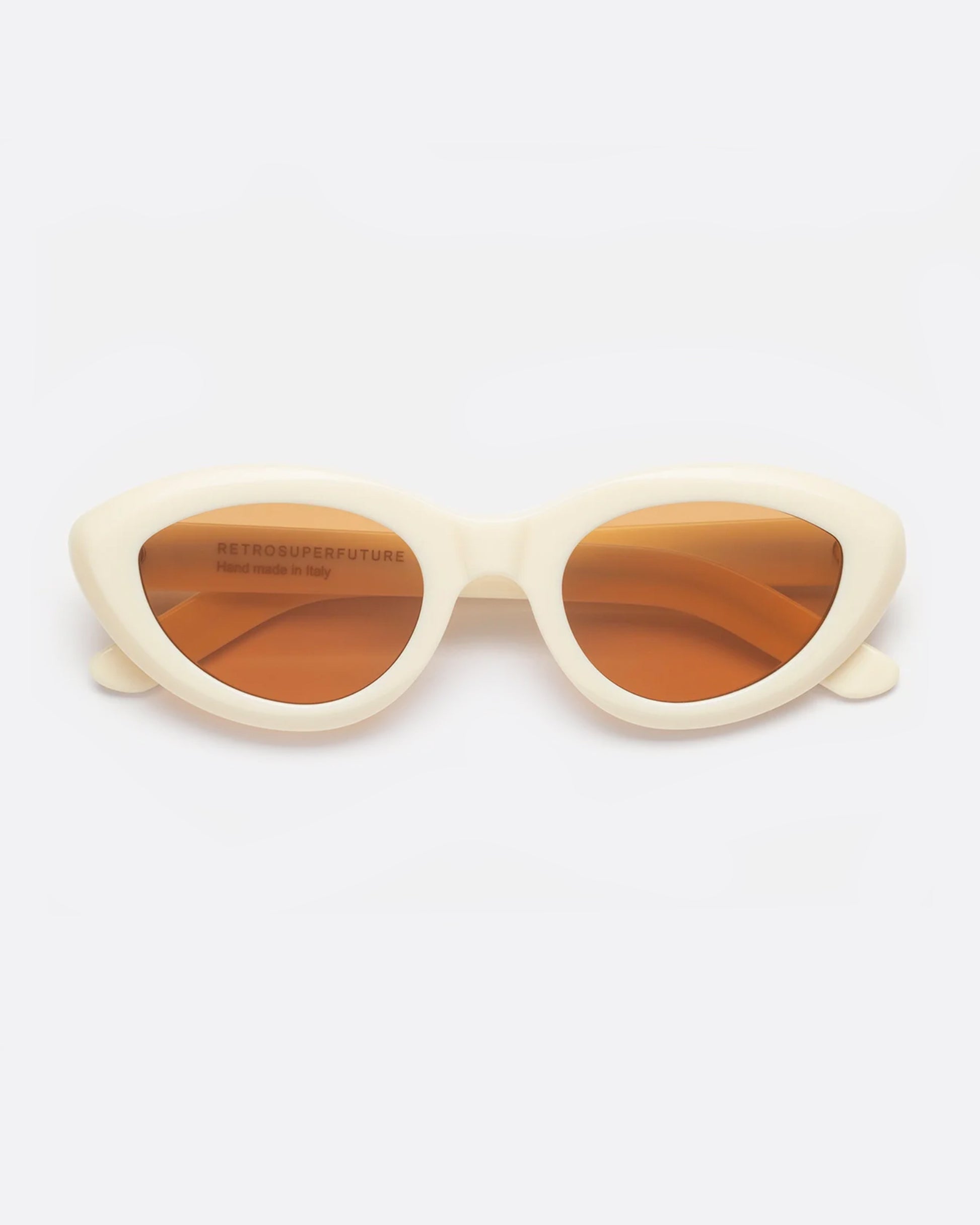 A fresh take on vintage cat- eye shades... thick, curvaceous frames in solid cream with brown lenses.