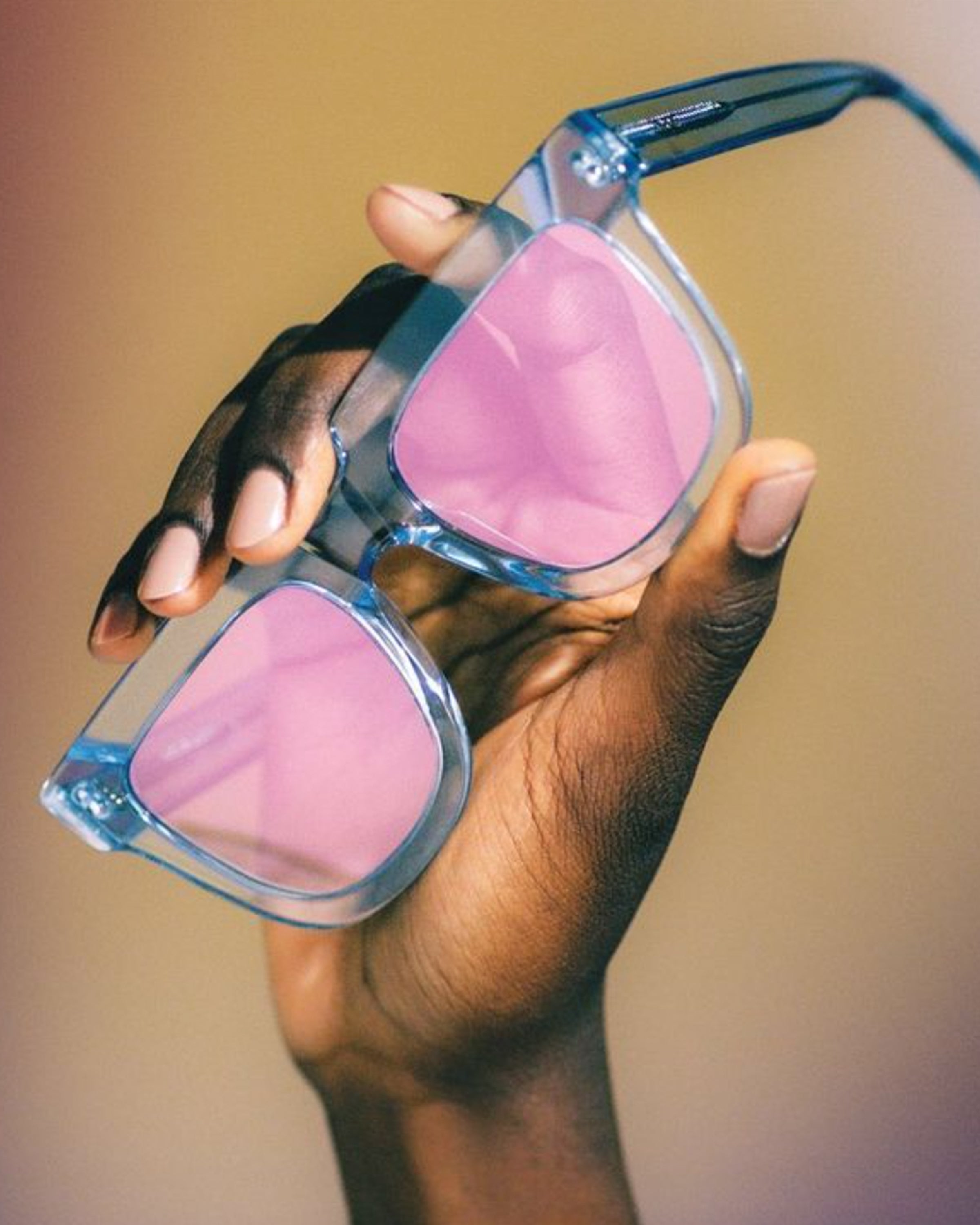 A pair monochromatic, teal glasses with transparent, geometric frames.