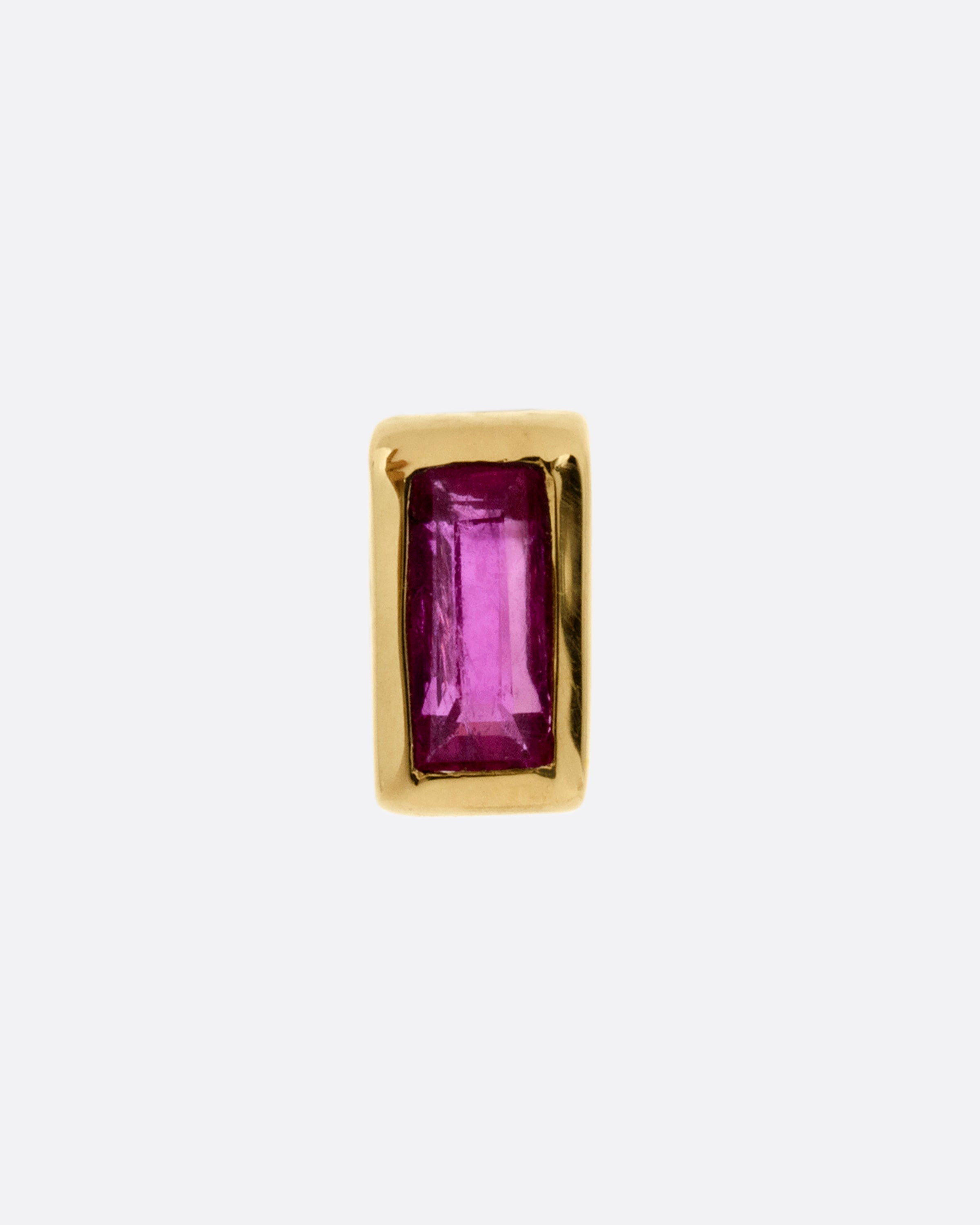 Baguette cut and bezel set, this ruby stud smolders among your curated stack