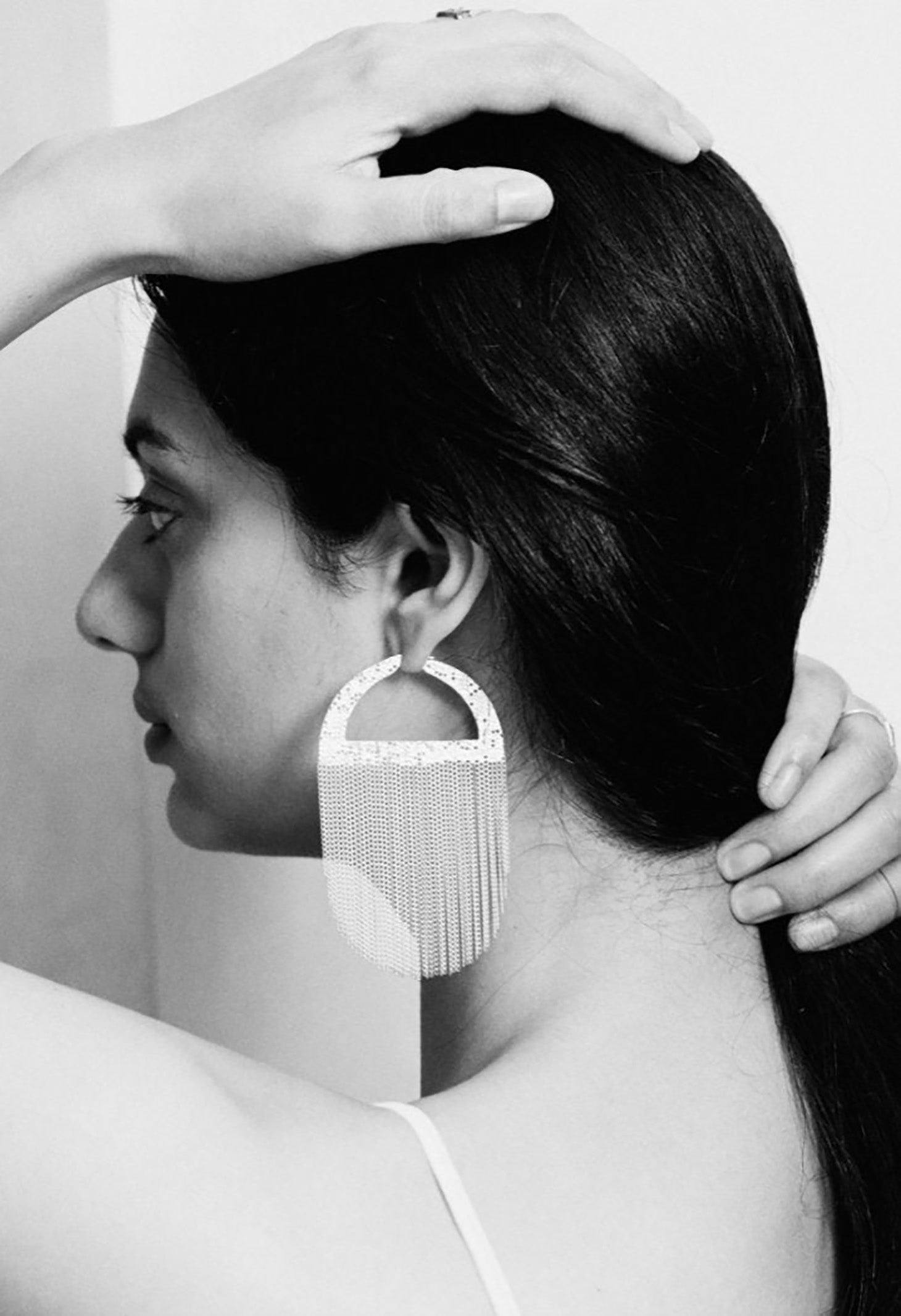Large square earrings, with a diagonal line that separates chain from solid for a unique 70's inspired style.