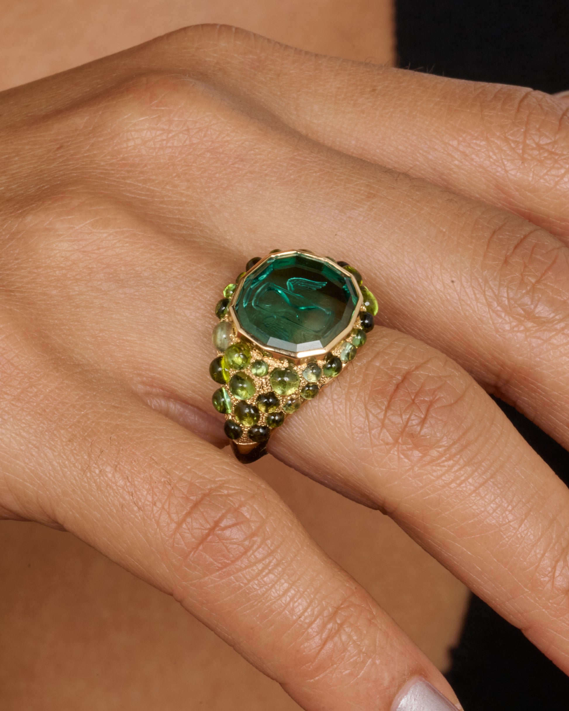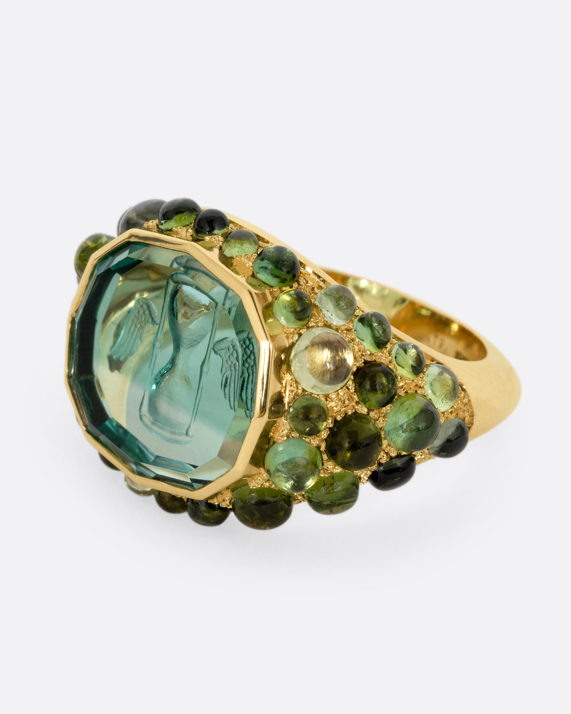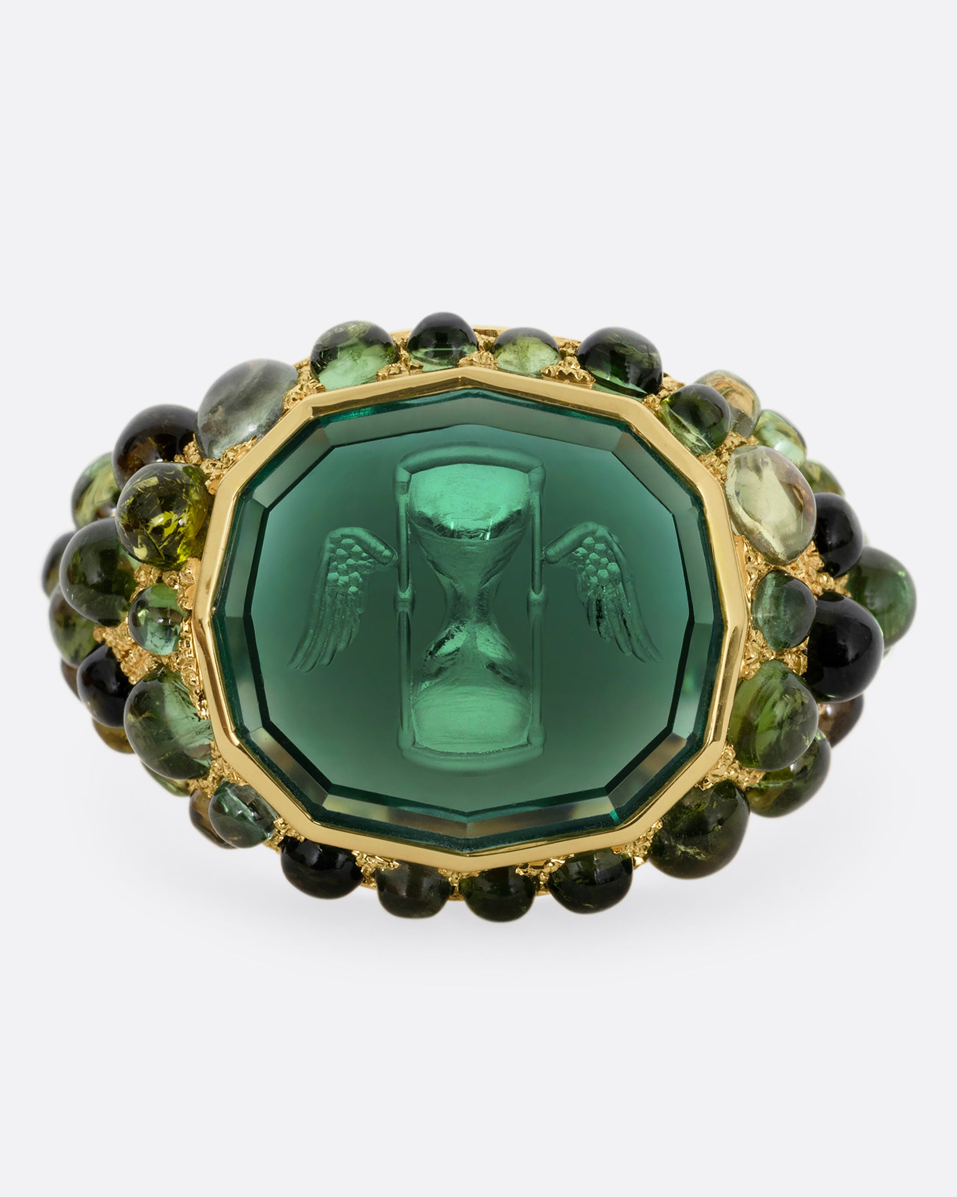 Oh how time flies! Nestled in this dimensional signet band, a hand carved winged hourglass hovers in a bicolor green tourmaline. An array of thoughtfully set green sapphire and tourmaline cabochons envelop this weighty band and highlight the dual color of the stone. An exceptional statement piece.