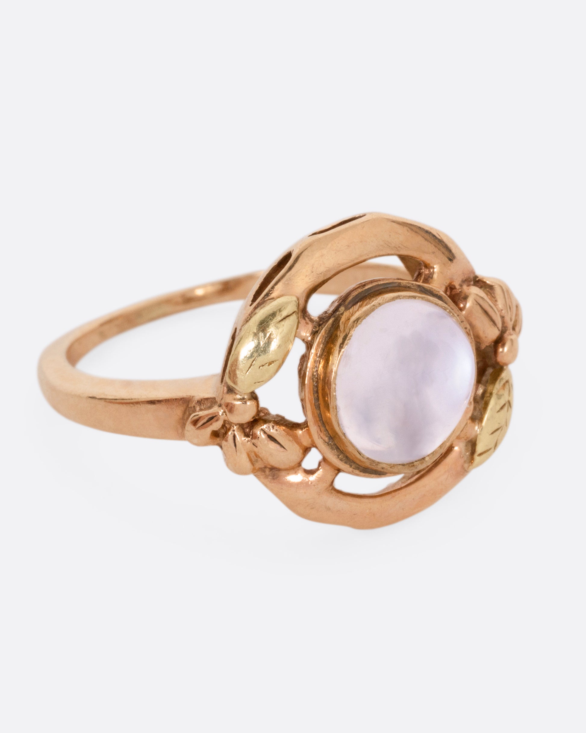 Like a full moon peeking through the trees, this moonstone cabachon sits amidst rose and yellow gold foliage. An etheral standalone ring.