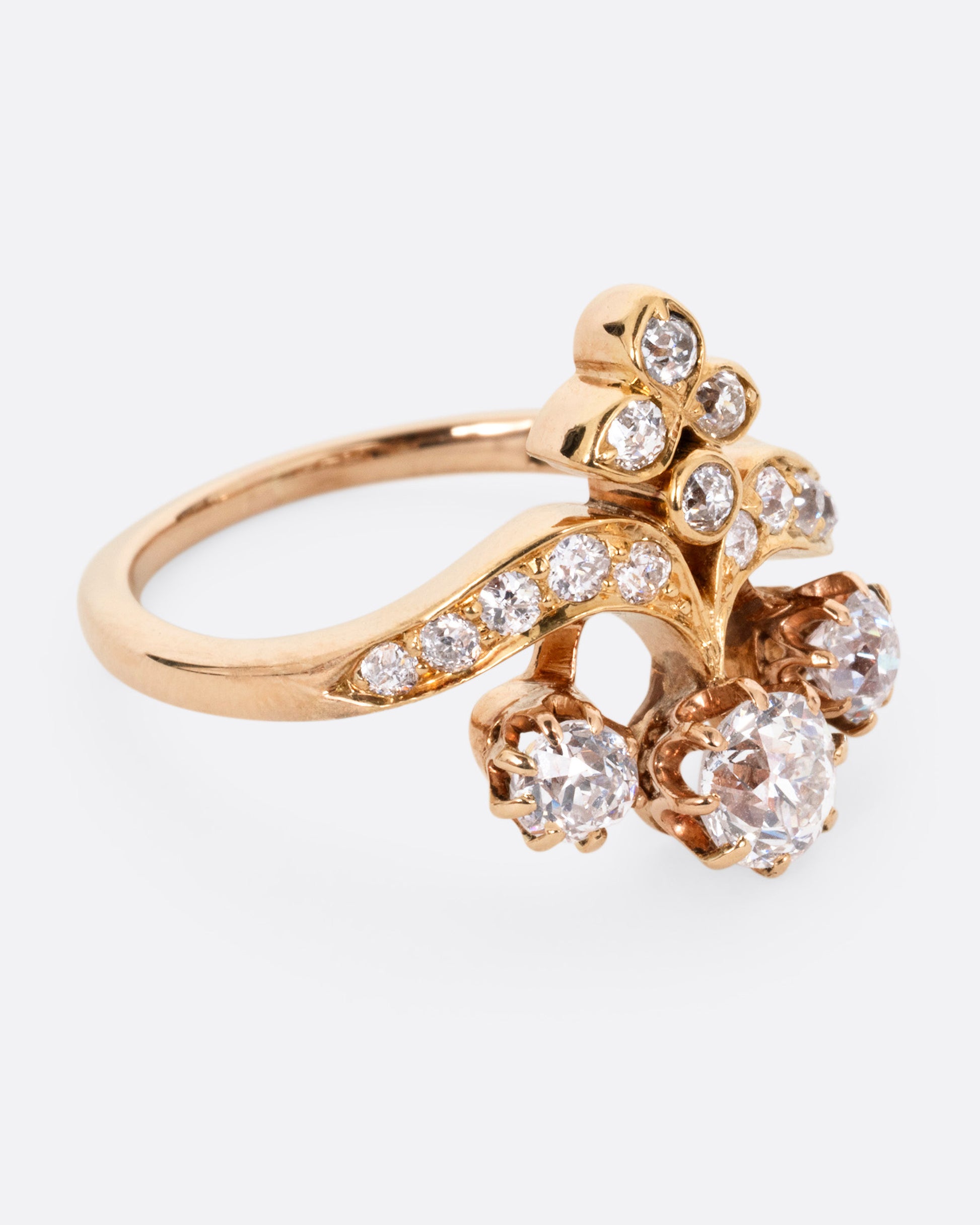 Crafted in a mix of rose and yellow gold, this intricate ring features all hand cut Old European diamonds in varying sizes. A beautiful way to mix metals.