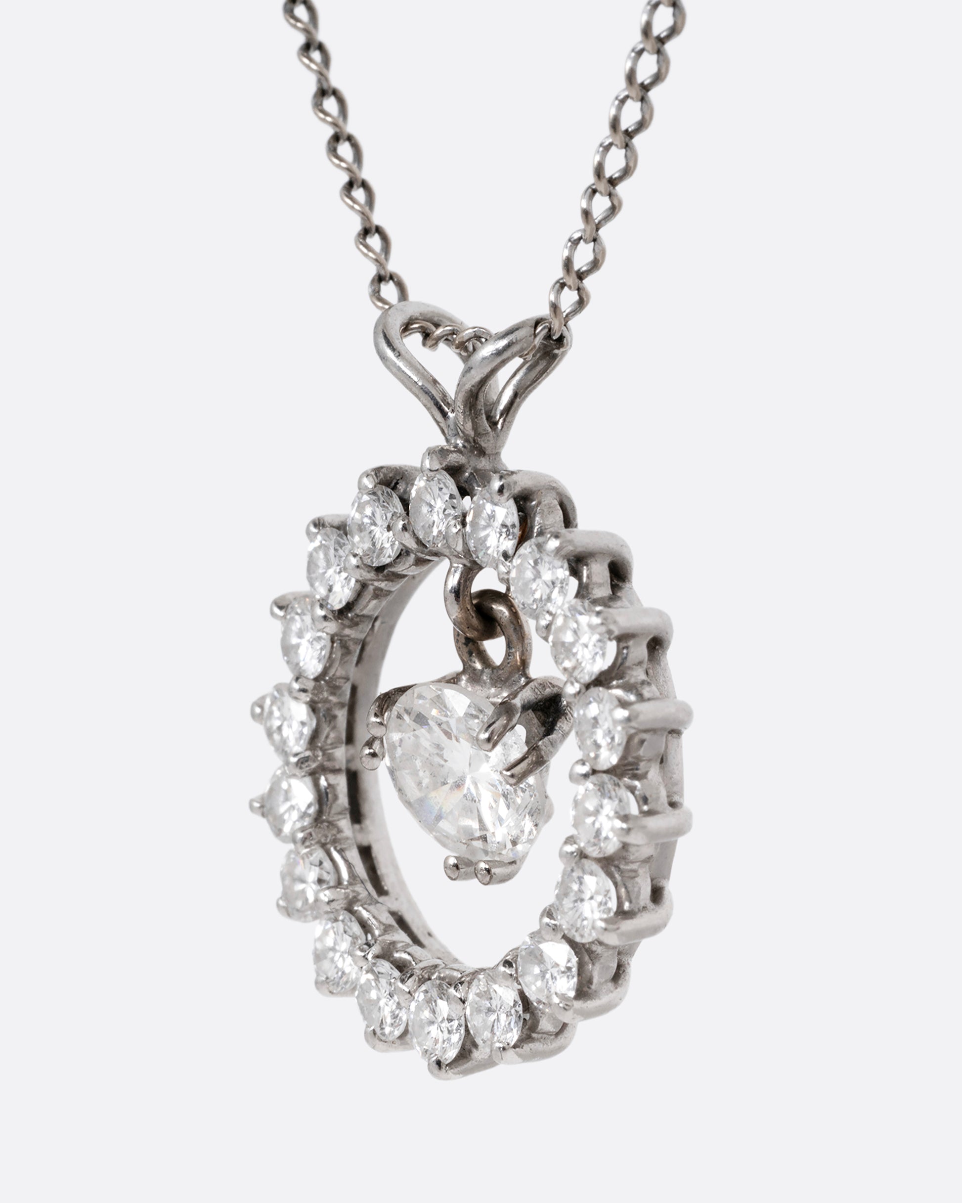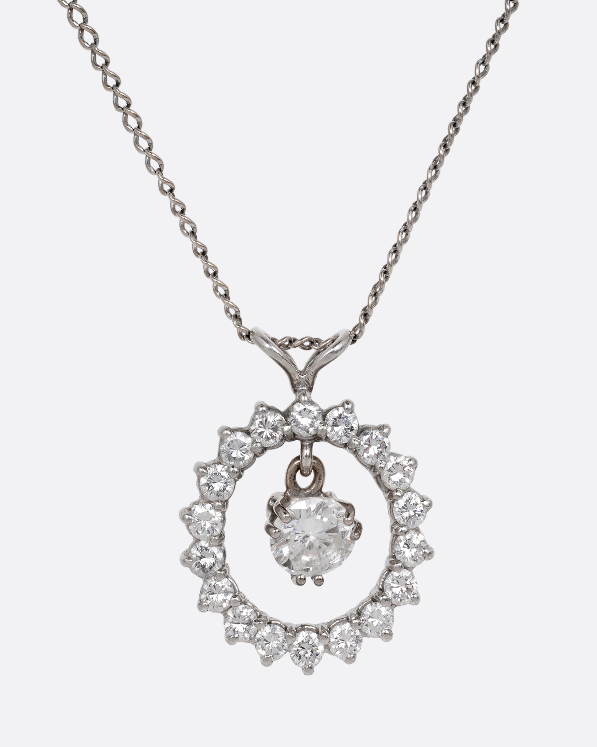 Set your neckline aglow with this diamond studded circular pendant. A brilliant diamond dangle dances at its center, adding movement as well as sparkle.