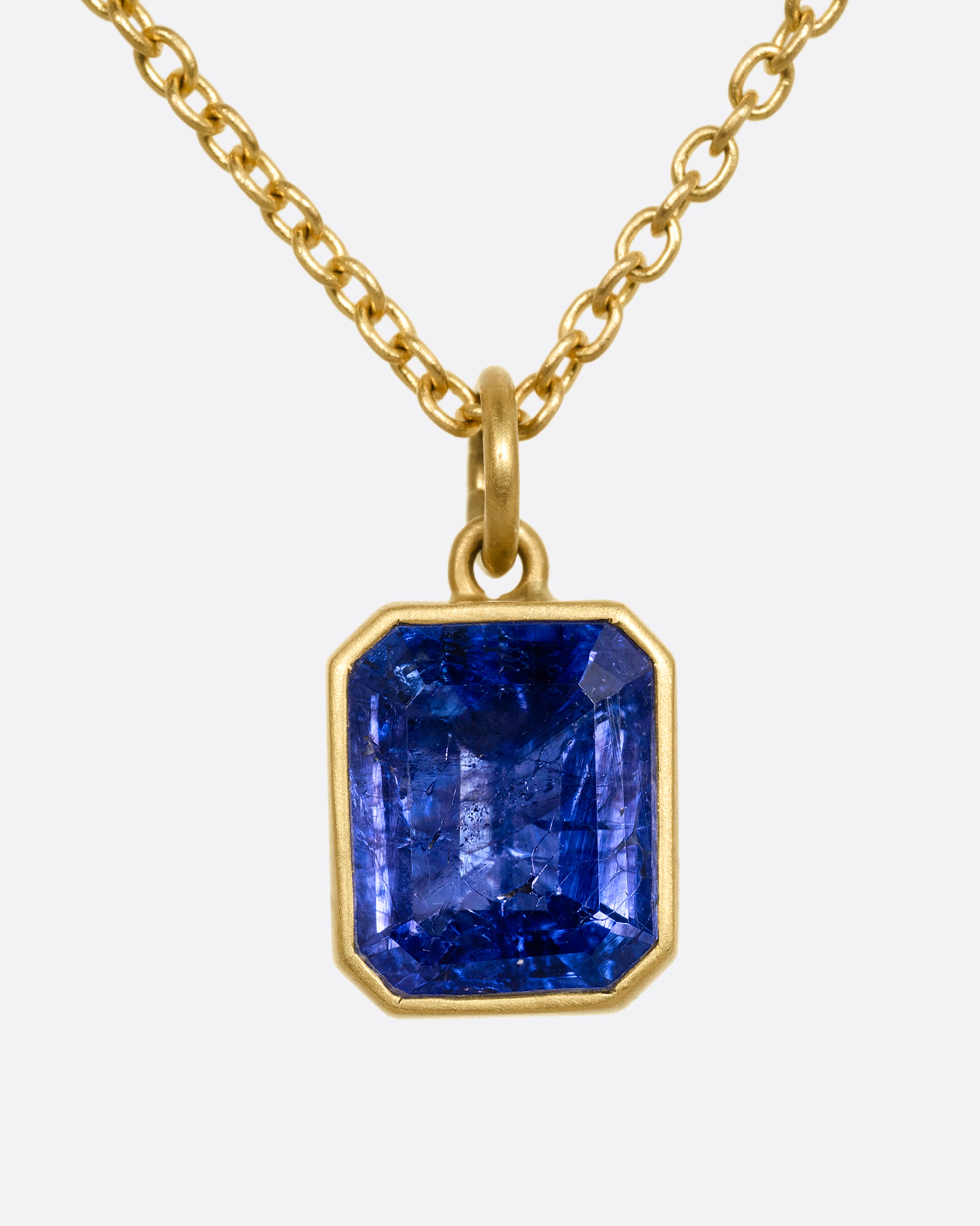 A chunky emerald cut tanzanite glows from a satiny yellow gold bezel