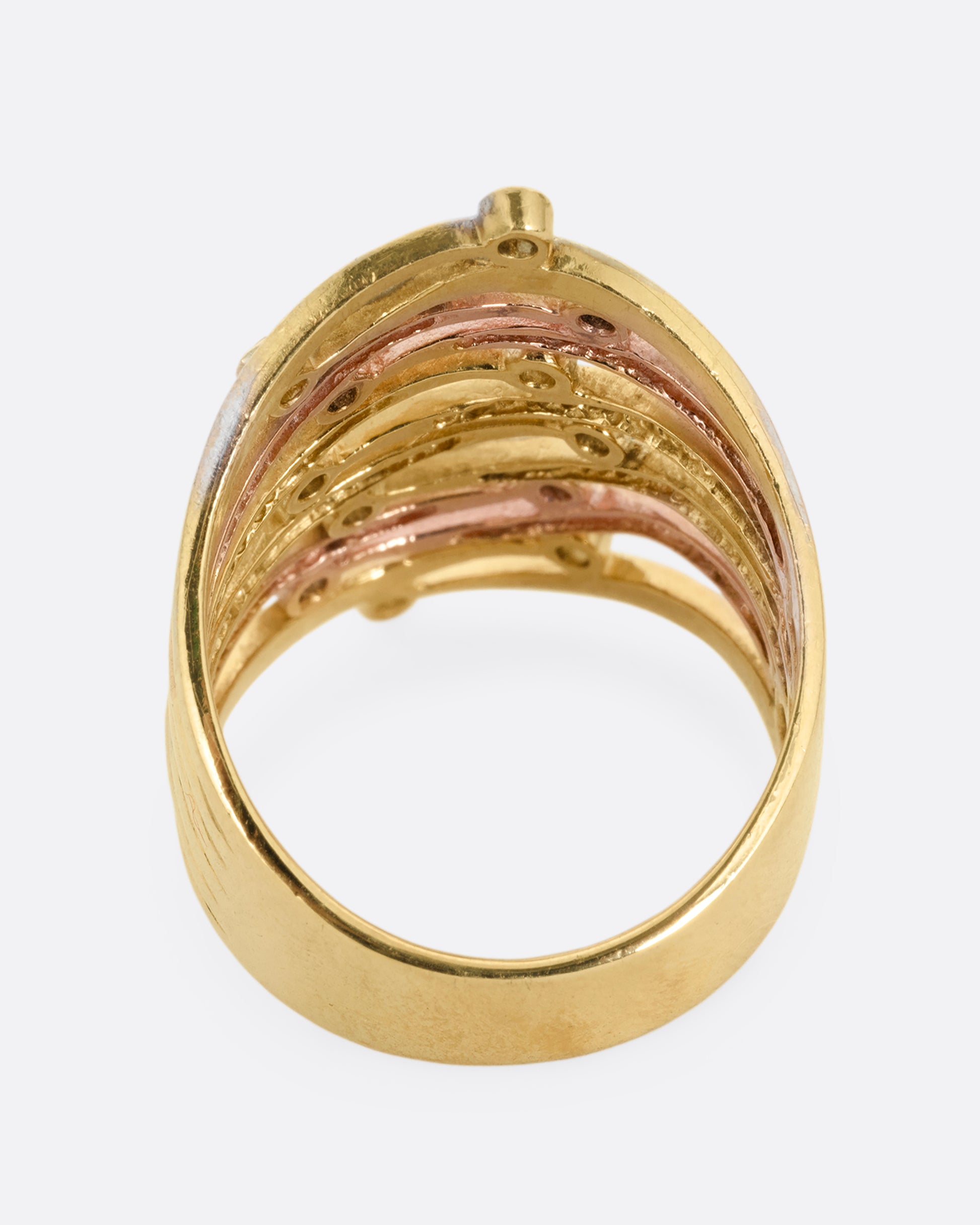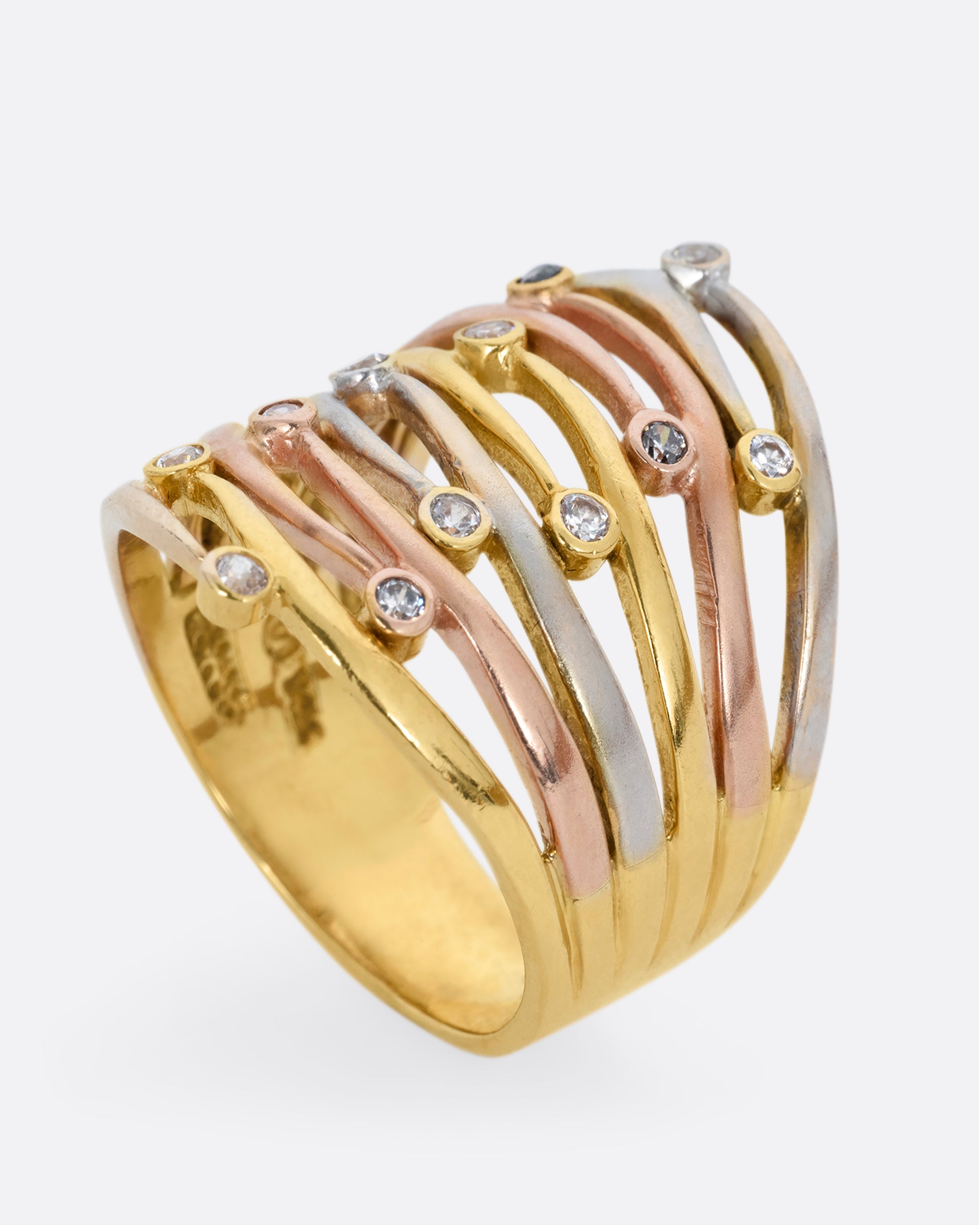 Round bezel set diamonds freckle the face of this layered statement ring. Open cutouts and a tapered back make this mixed metal band an easy to wear, versatile piece.