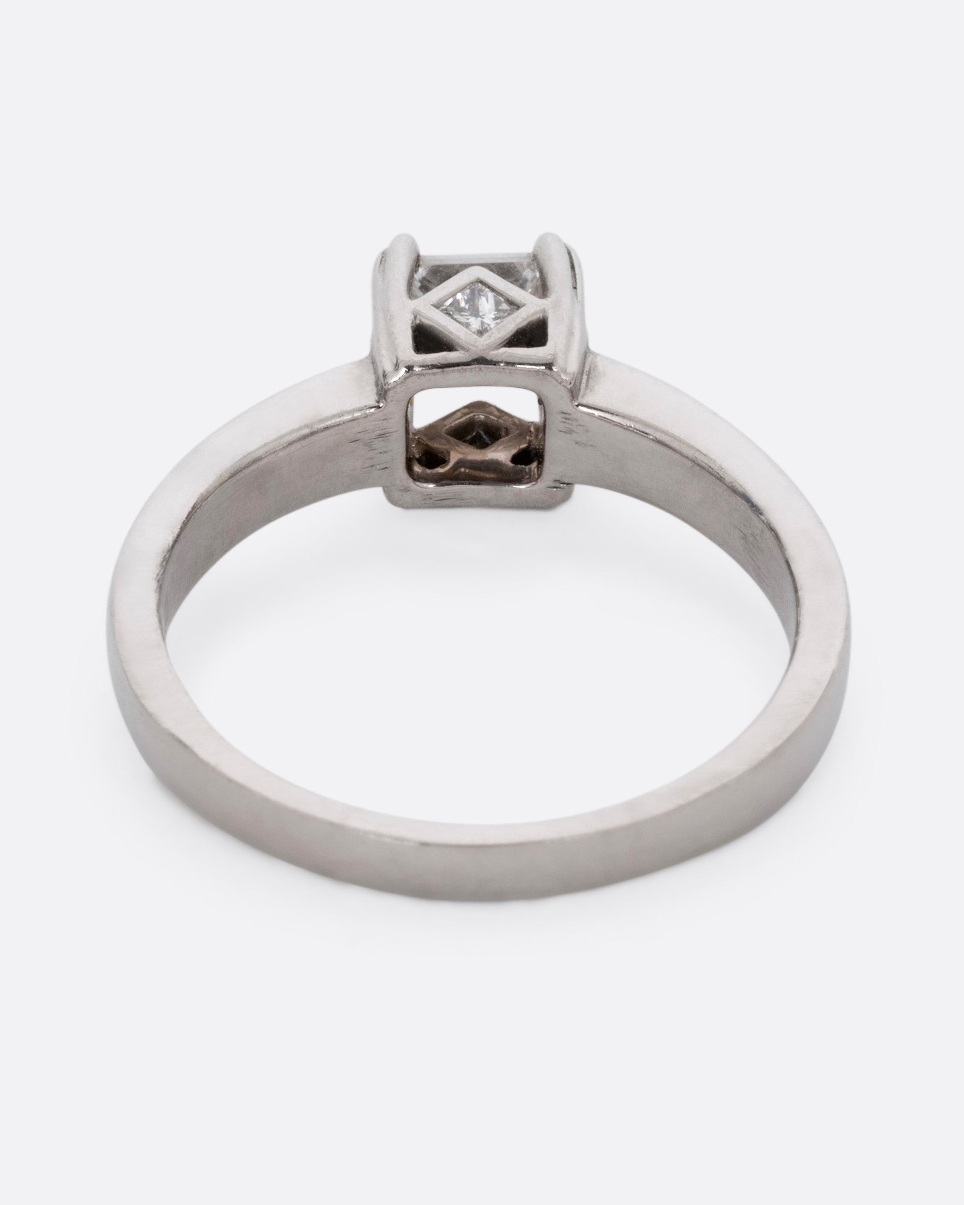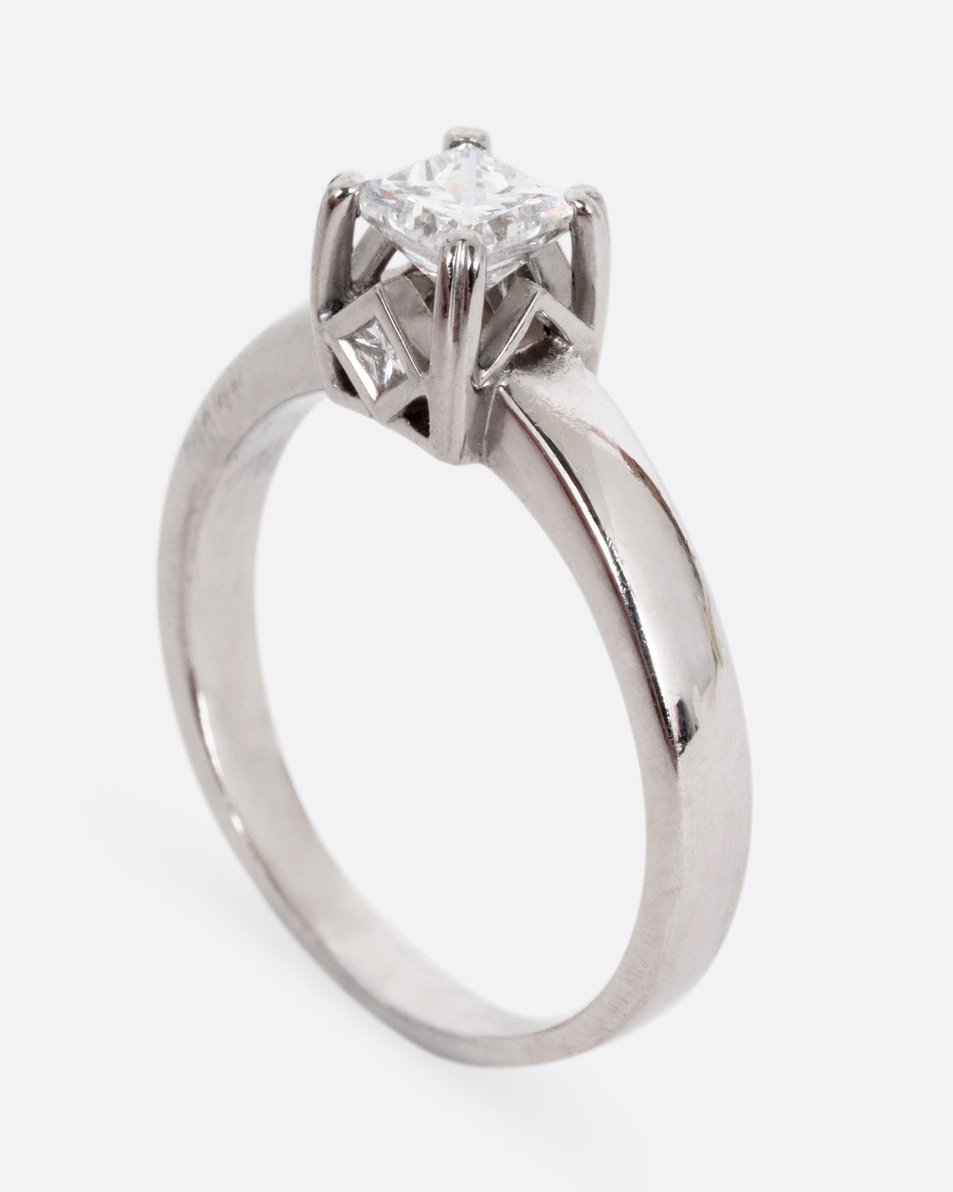 This weighty platinum band features a princess cut diamond, prong set high above angular cutouts and diamond accents.