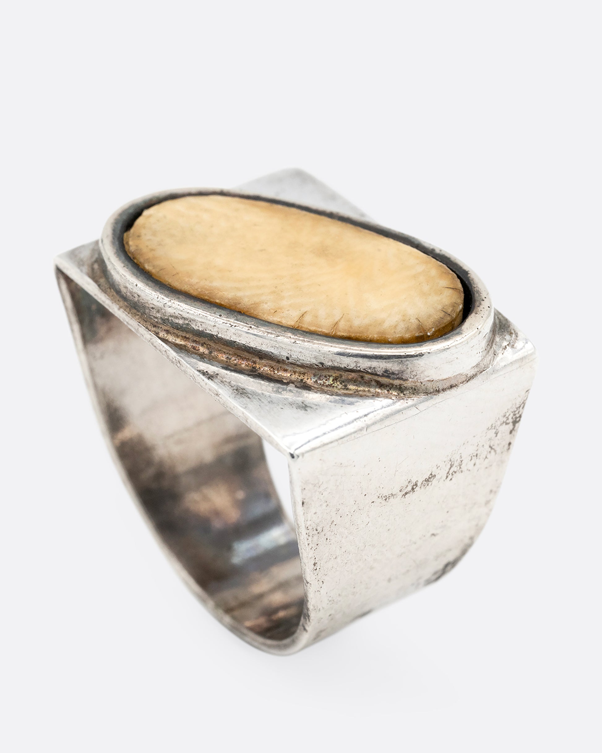 With an oval shaped bone set diagonally across its face, this broad sterling signet adds a cool vintage edge to your set up.
